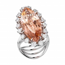 В центре композиции – морганит из Бразилии весом 27,34 карата, один из самых чувственных представителей семейства бериллов. Этот драгоценный камень ценится за свой утончённый розово-персиковый оттенок, символизирующий нежность и искренние чувства. Благодаря природной прозрачности и редкому внутреннему свечению морганит создаёт впечатление, будто в нём заключено само тепло прикосновения.