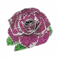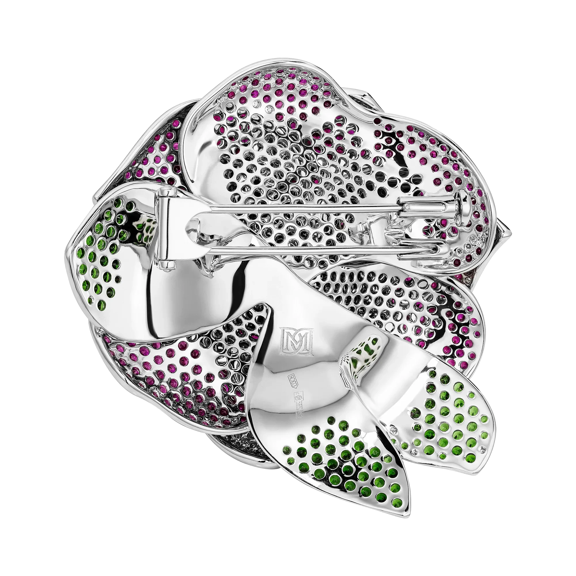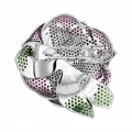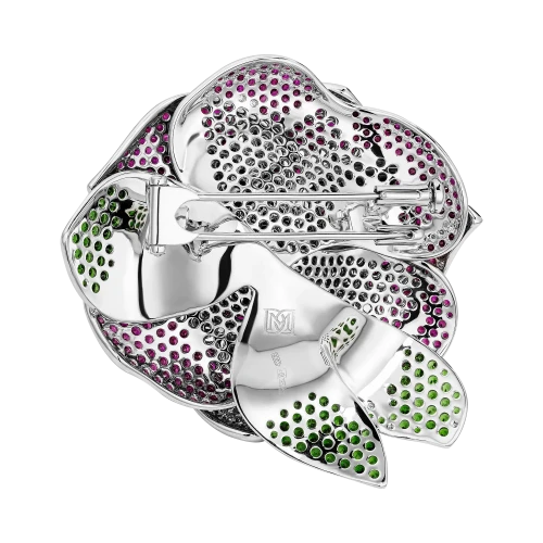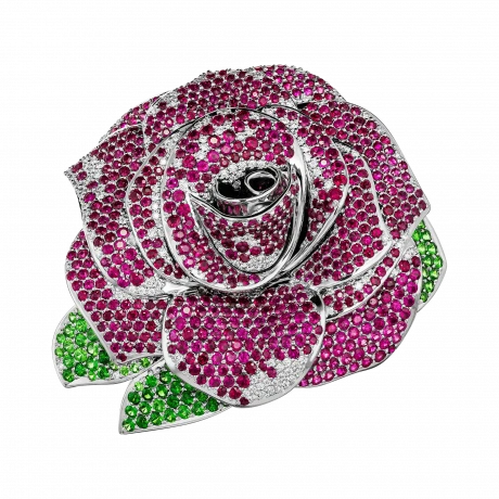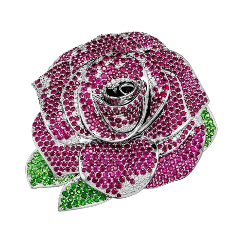 Распускающаяся роза, ставшая формой броши, раскрывается как символ притяжения и обновления. Более пятисот рубинов, расшитых по лепесткам, создают бархатистую поверхность и насыщенный алый оттенок, в котором ощущаются тепло и движение. Восемьдесят пять тсаворитов вносят свежий зелёный акцент, словно напоминание о живой природе, окружающей цветок в мягкой полутени сада.