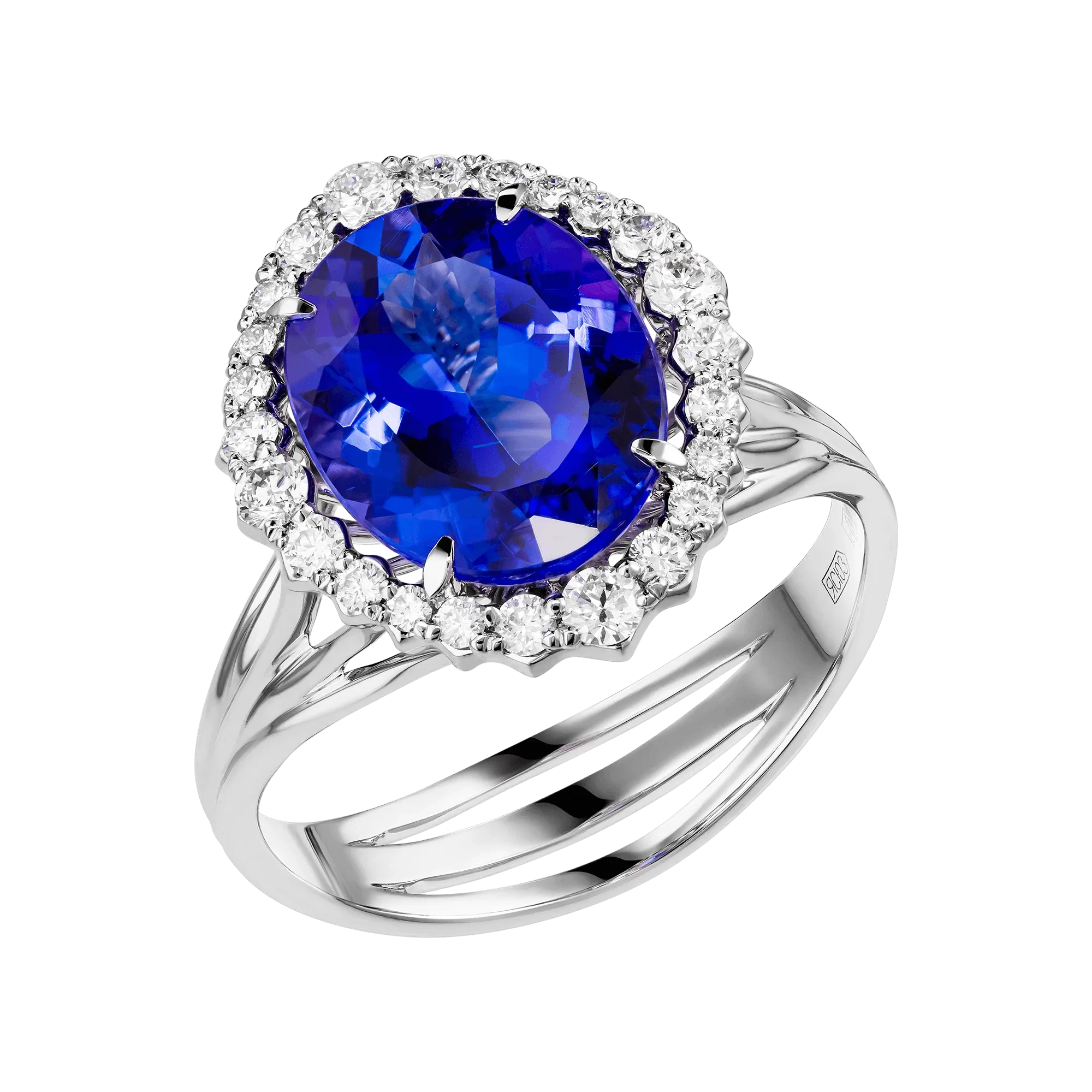 Ореол из бриллиантов подчёркивает глубину цвета, подобно тому, как звёзды усиливают сияние небесного свода. Белое золото оправы добавляет композиции холодной чистоты и гармонии, превращая драгоценные камни в поэтическое отражение высоты.