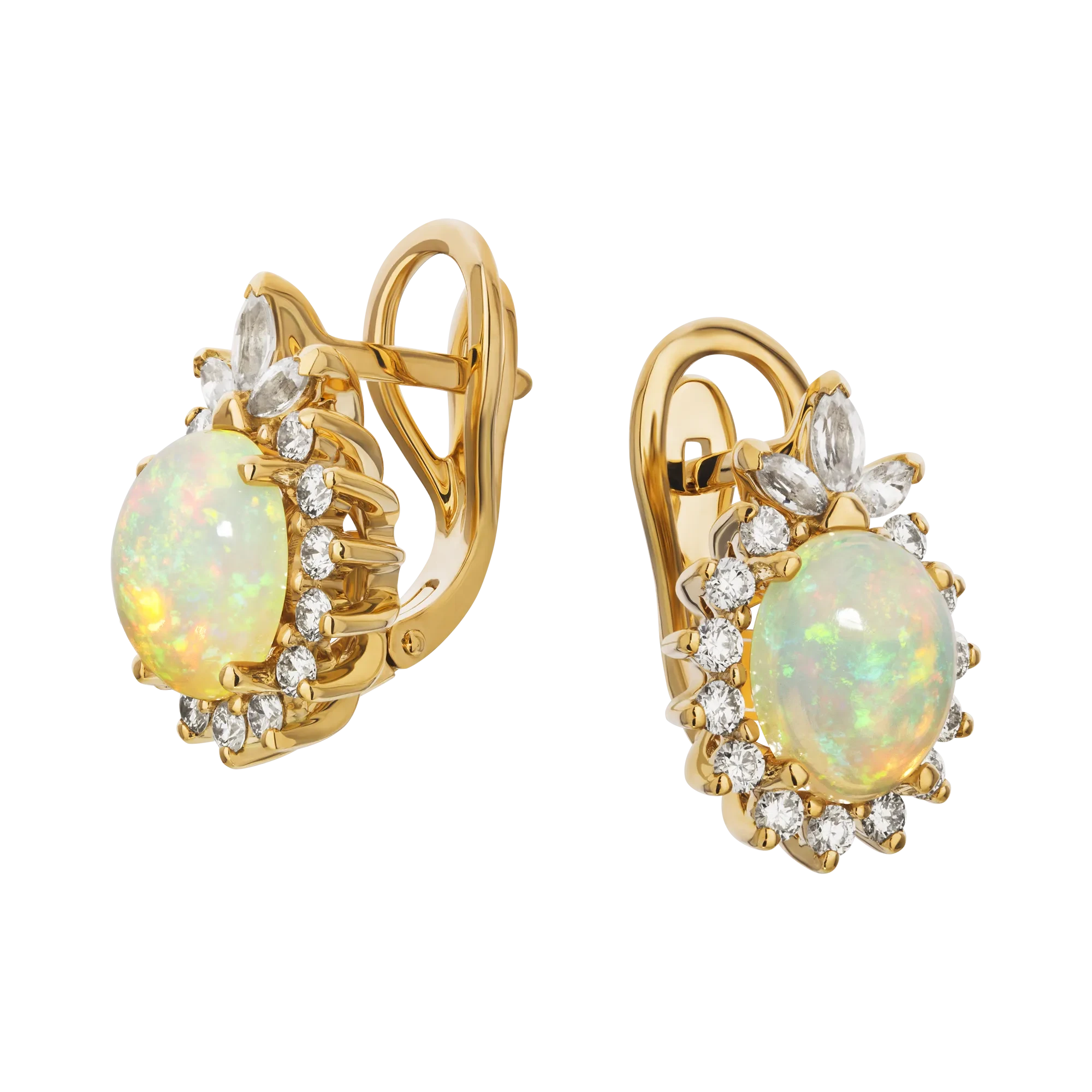 В серьгах «Разноцветная энергия» две гладкие капли из Эфиопии, виртуозно ограненные в форме кабошонов, ювелиры мастерски оправили в сдержанные линии желтого золота. Элегантные, но, от этого очень чувственные объятия центральных самоцветов общим весом 2,55 карата и благородного металла идеально подчеркнуты чистым блеском бриллиантов и сапфиров. Каждый раз, когда окружающие будут видеть на прекрасной даме эксклюзивные серьги, украшенные опалами, они обязательно отметят для себя, что она буквально вся сияет, а в ее глазах горит огонек.
