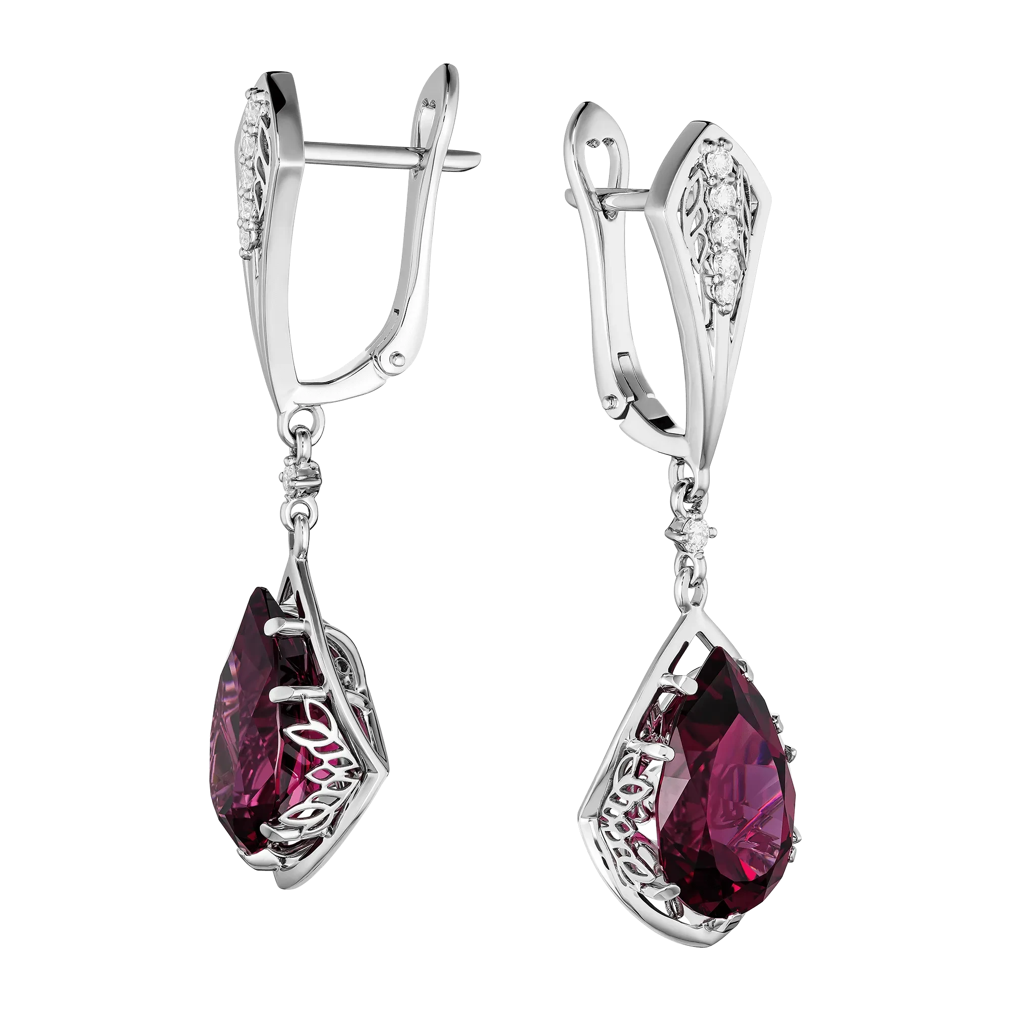 Родолиты из Танзании, ставшие центральными акцентами серёг, отличаются насыщенным винно-пурпурным оттенком и высокой чистотой. Камни этого происхождения ценятся за плотность цвета и умение удерживать свет внутри кристалла. Огранка подчёркивает глубину оттенка, делая его спокойным, уверенным и визуально устойчивым.