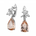 Привлекательность украшения гарантируют роскошные морганиты нежно-пудрового цвета. Фантазийная игра света, рождаемая в глубинах персиковых самоцветов, в меру сочная и, в то же время, очень нежная, смотрится невероятно изысканно в обрамляющих центральные кристаллы бриллиантах и сапфирах, собранных ювелирами в фигуры легкокрылых стрекоз.