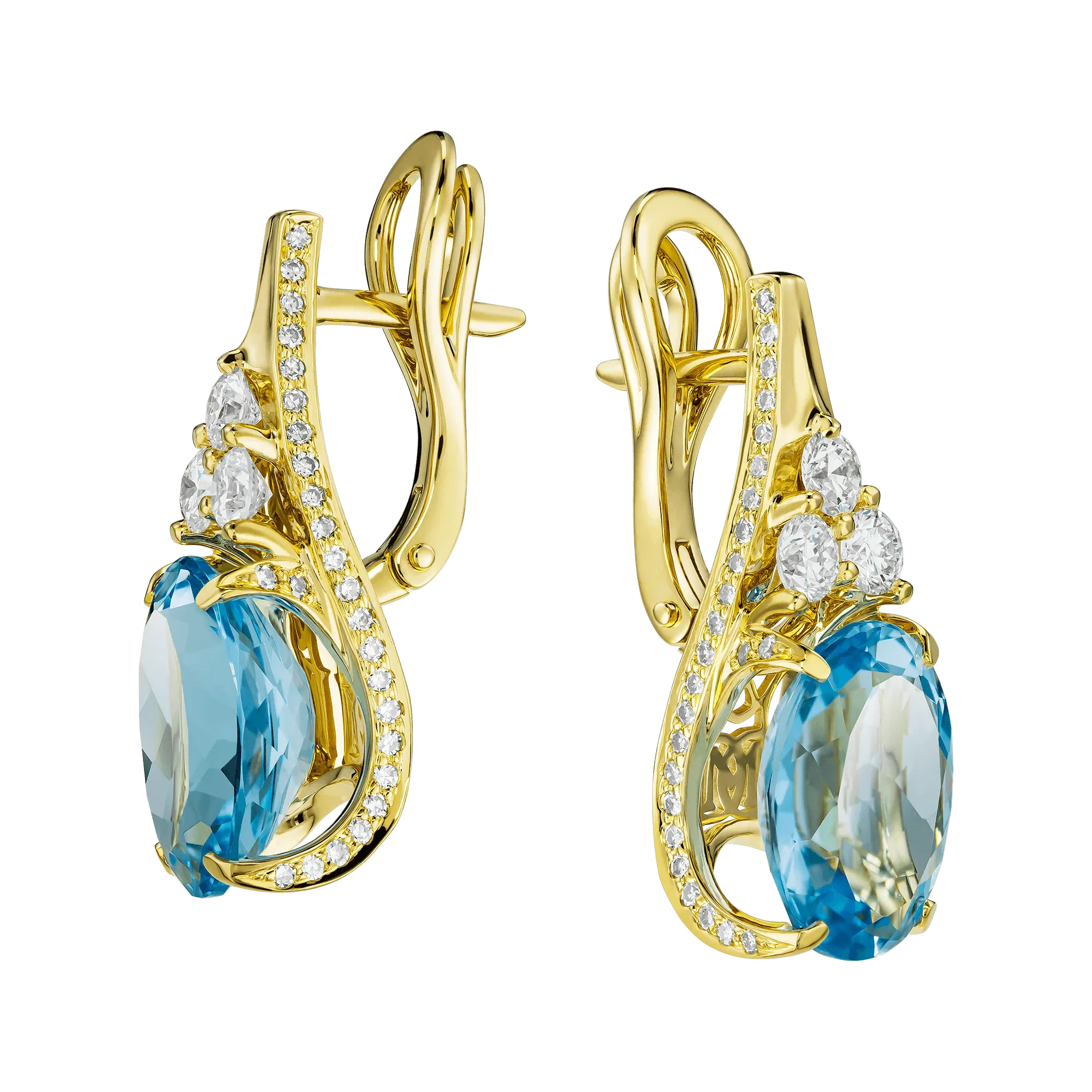 Бриллианты формируют вокруг топазов тонкое световое окружение, усиливая их прозрачность и добавляя живую игру бликов. Жёлтое золото оправы вносит тёплый акцент, уравновешивая прохладную палитру и подчёркивая изящную архитектуру формы.