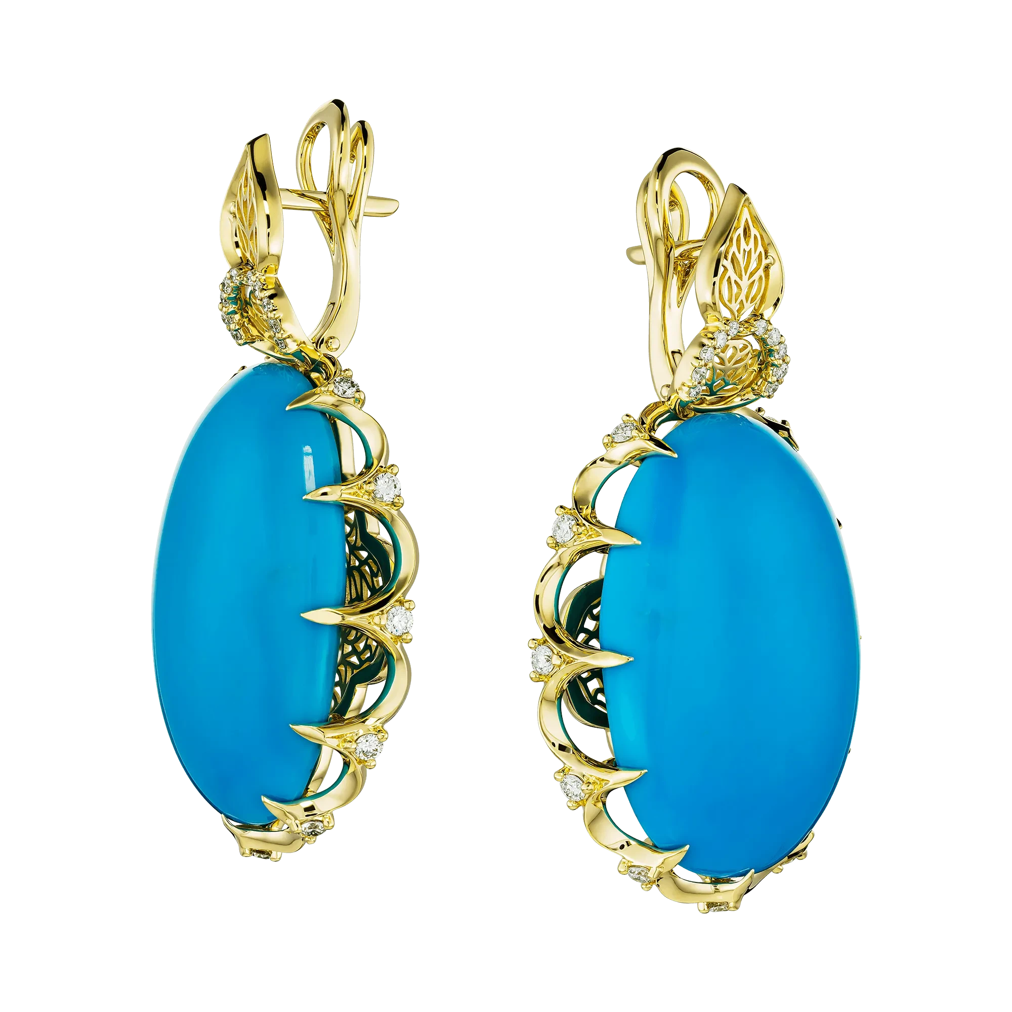 В композиции использован дуэт природных кабашонов из Аризоны общим весом 64,50 карата. Эти самоцветы ценятся за выразительность небесно-голубого оттенка, мягкую глубину цвета и естественный природный рисунок. Каждая бирюза индивидуальна, словно отдельная остановка на пути, и именно эта неповторимость формирует живой, подвижный характер украшения.