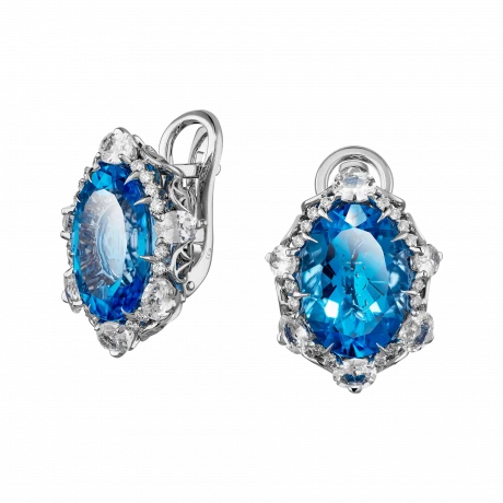 Так появились серьги из белого золота с кульминацией в виде великолепных топазов оттенка Super Swiss, легко узнаваемого и потому особо ценимого любителями и специалистами. Голубые глубины заманчиво сияющего дуэта идеально просматриваются, благодаря прозрачности, в которую легко проникает блеск сапфиров и бриллиантов различной огранки.