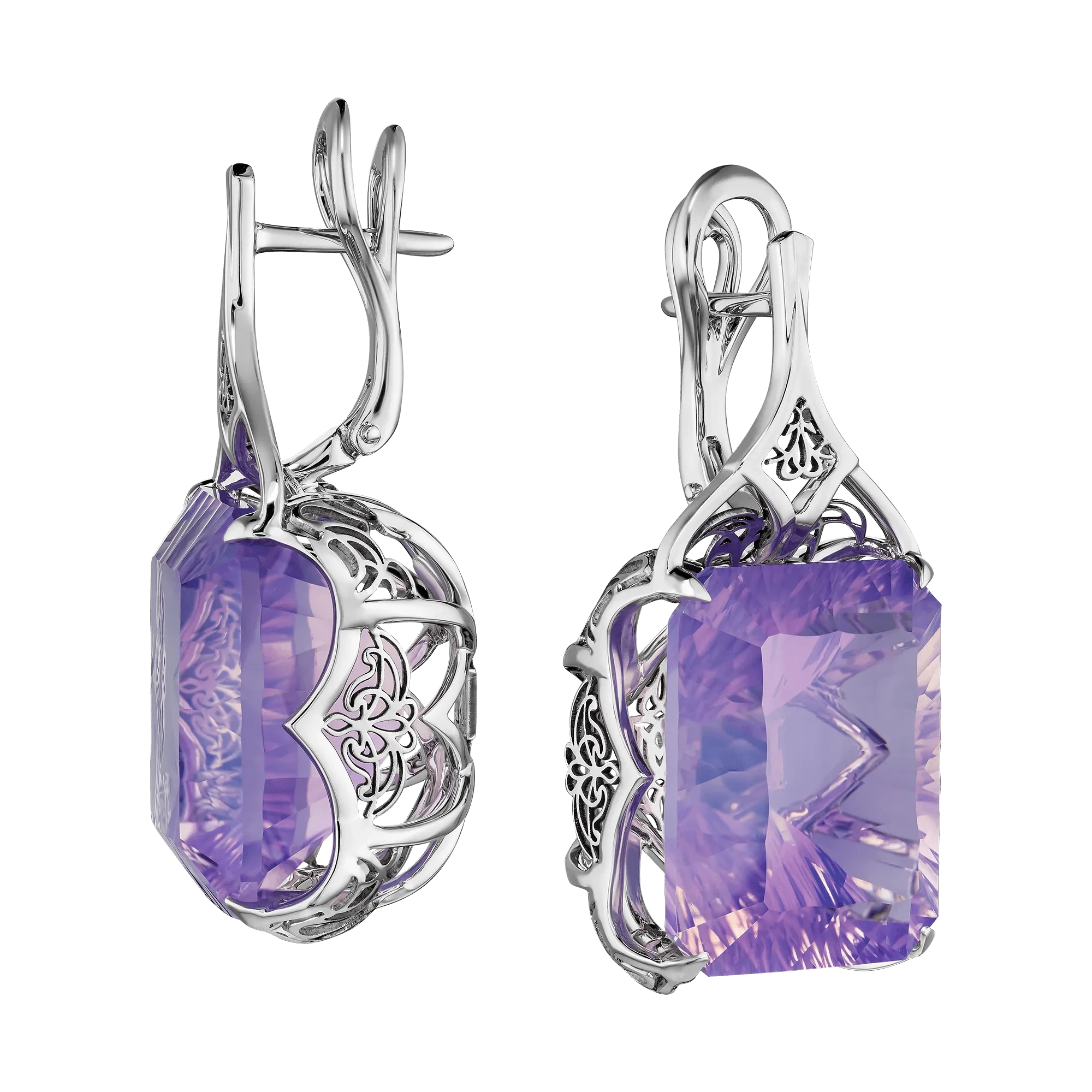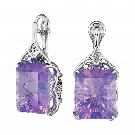 Необычная огранка позволяет свету свободно проходить сквозь природные камни, проявляя тонкое кружево линий оправы из белого золота. Металл не доминирует, а словно вплетён в структуру украшения, поддерживая аметисты деликатно и точно, создавая ощущение невесомости и пространственной чистоты. Серьги выстроены так, чтобы сохранять баланс между масштабом камней и лёгкостью восприятия.