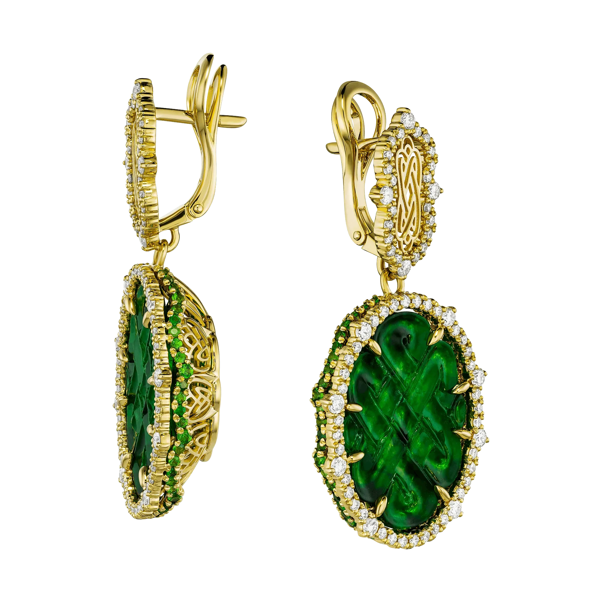 Ореол из бриллиантов и тсаворитов формирует чёткую световую структуру, усиливая насыщенность зелёного оттенка и подчёркивая графику резьбы. Жёлтое золото оправы добавляет композиции торжественный ритм и архитектурную завершённость, выстраивая баланс между декоративностью и строгой формой.