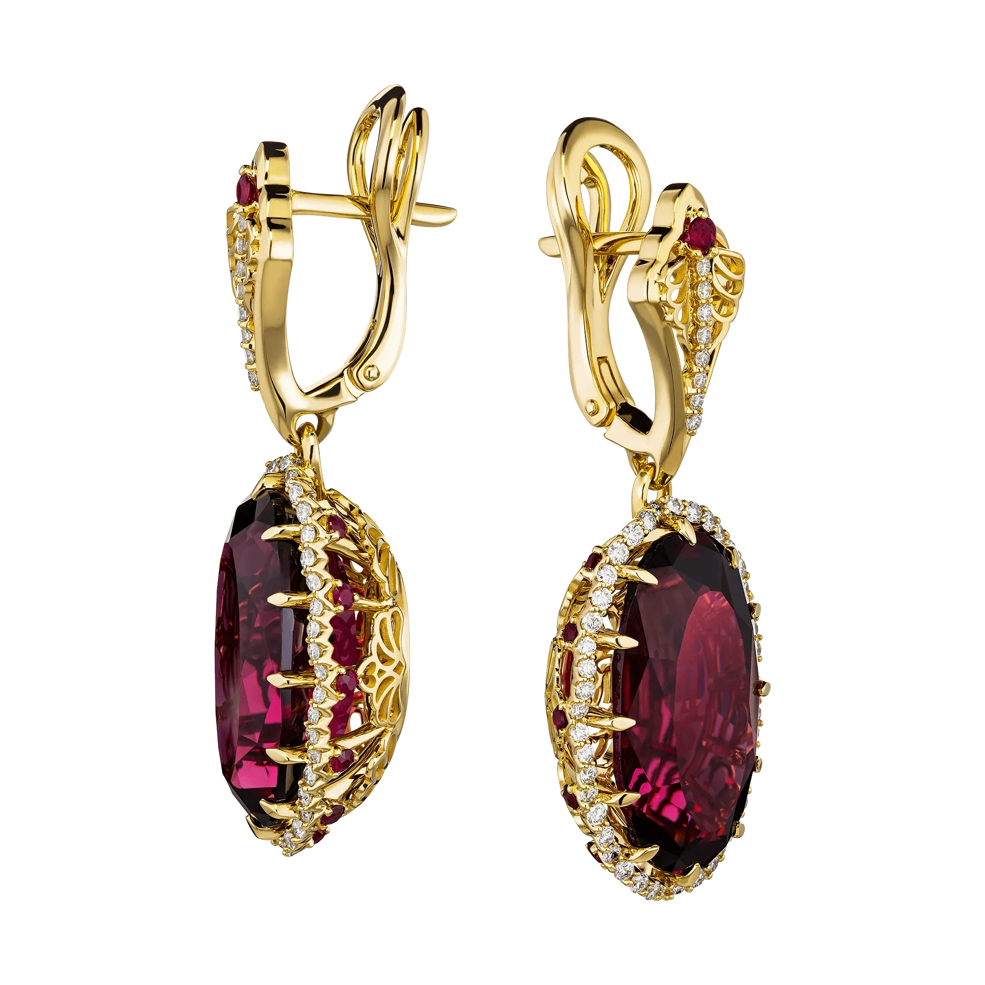 В серьгах «Напоенный силой огня» танзанийские родолиты общим весом 23,46 карат раскрывают всю силу своего сияния. Их насыщенное свечение перекликается с отблесками рубинов и бриллиантов, рассыпанных по оправе из жёлтого золота. Здесь каждый луч света словно пробуждает движение – линии металла обнимают самоцветы так, будто удерживают пламя в его мгновении, не давая ему угаснуть.