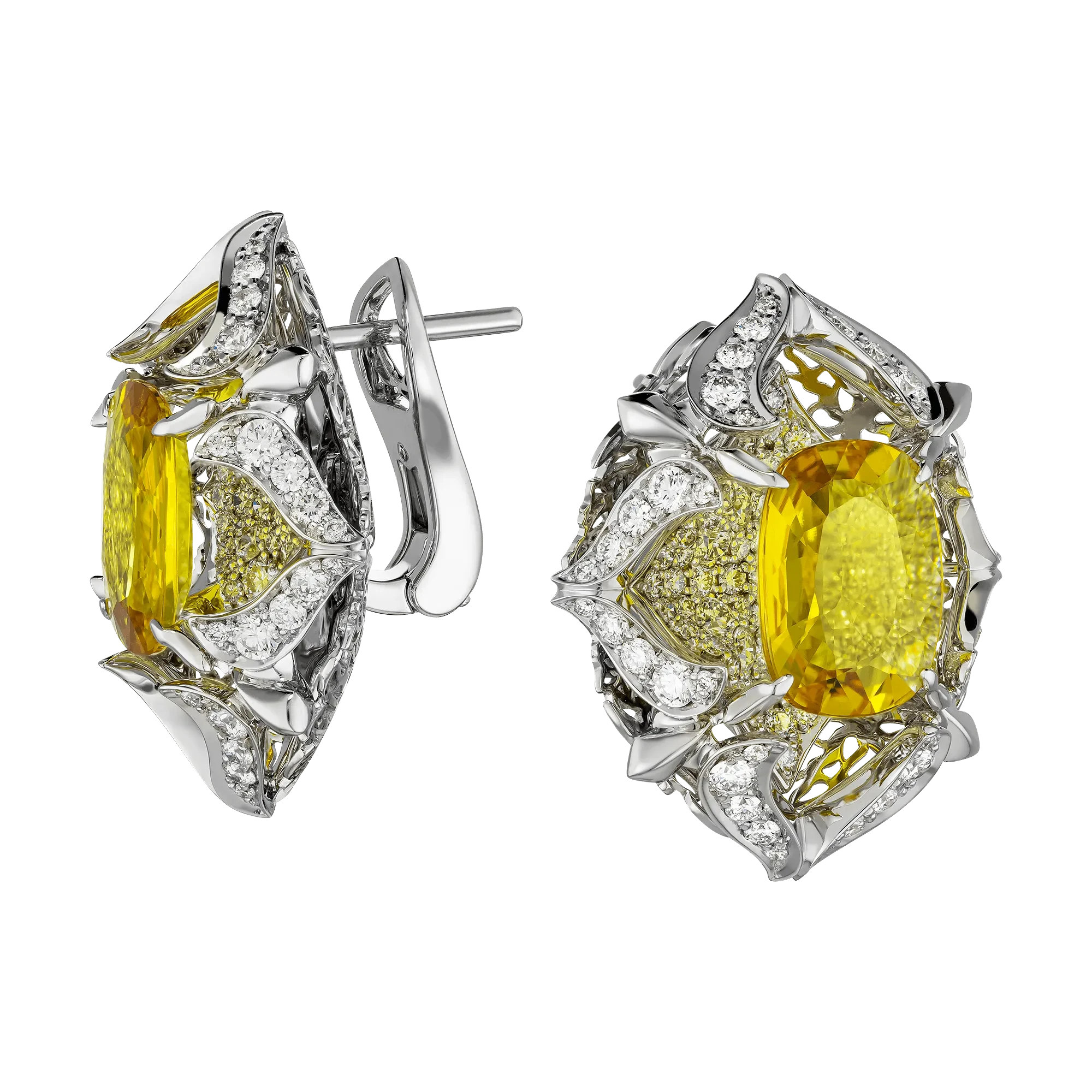 В центре композиции — жёлтые сапфиры общим весом 7,54 карата, рождённые природой Шри-Ланки. Их мягкое сияние напоминает о тепле парижских фонарей, растворяющихся в воздухе золотистой дымкой. Драгоценные камни словно несут в себе палитру Монмартра — ту самую, в которой свет превращается в искусство.