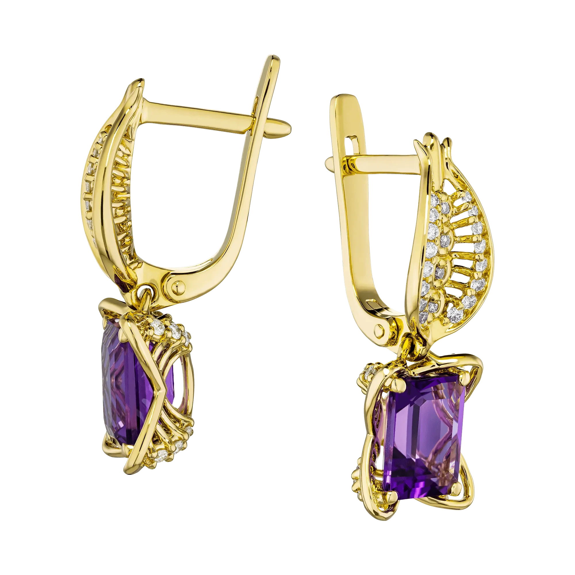 Оправа из жёлтого золота формирует изящный силуэт серёг и поддерживает центральные камни тёплым сиянием. Россыпь бриллиантов в верхней части добавляет мерцание и усиливает световой ритм композиции. Серьги воспринимаются как символ направления и ясности — украшение, которое тонко подчёркивает образ и становится частью личного пути.