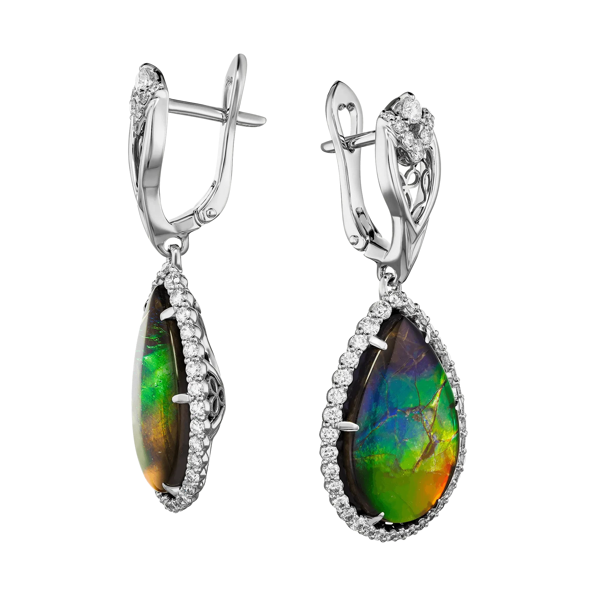 Оправы из белого золота, украшенные бриллиантами, обрамляют аммолиты сияющим ореолом, усиливая глубину цвета и подчёркивая природную сложность рисунка. Свет в подвижных серьгах словно пульсирует, напоминая о вечном дыхании океанов.