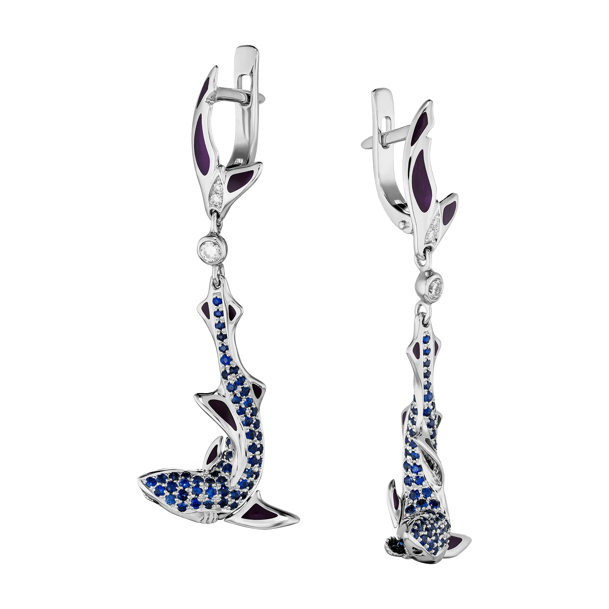 Белое золото формирует холодную, почти мистическую основу композиции, усиливая ощущение глубины и сосредоточенности. Контуры тела акулы выстроены так, чтобы передать напряжение и стремительность хищника. Синие сапфиры задают фактуру поверхности, перекликаясь с переливами океанской толщи, а чёрные бриллианты в глазах добавляют образу выразительность и характер.