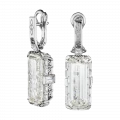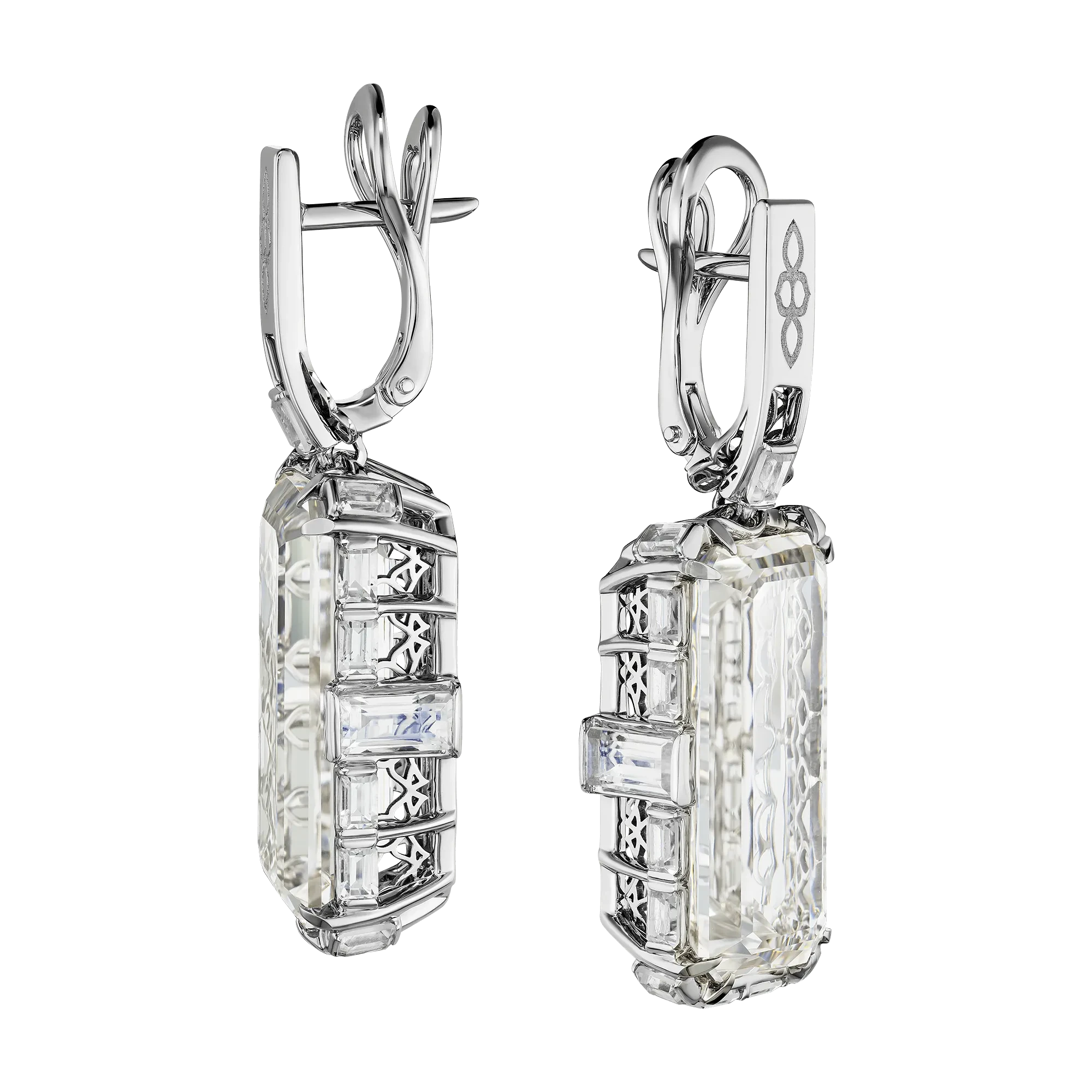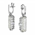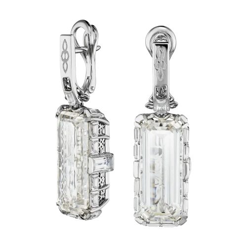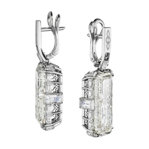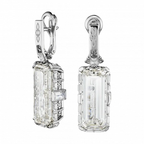 В выразительной композиции центральную роль играют данбуриты общим весом 25,51 карата, происходящие из исторически значимого бирманского месторождения. Эти редкие самоцветы ценятся за исключительную прозрачность и благородный стеклянный блеск. В подвижных серьгах свет свободно проходит сквозь толщу самоцветов, создавая эффект внутреннего свечения без резких бликов и визуальных искажений — качество, особенно значимое для украшений высокого ювелирного уровня.
