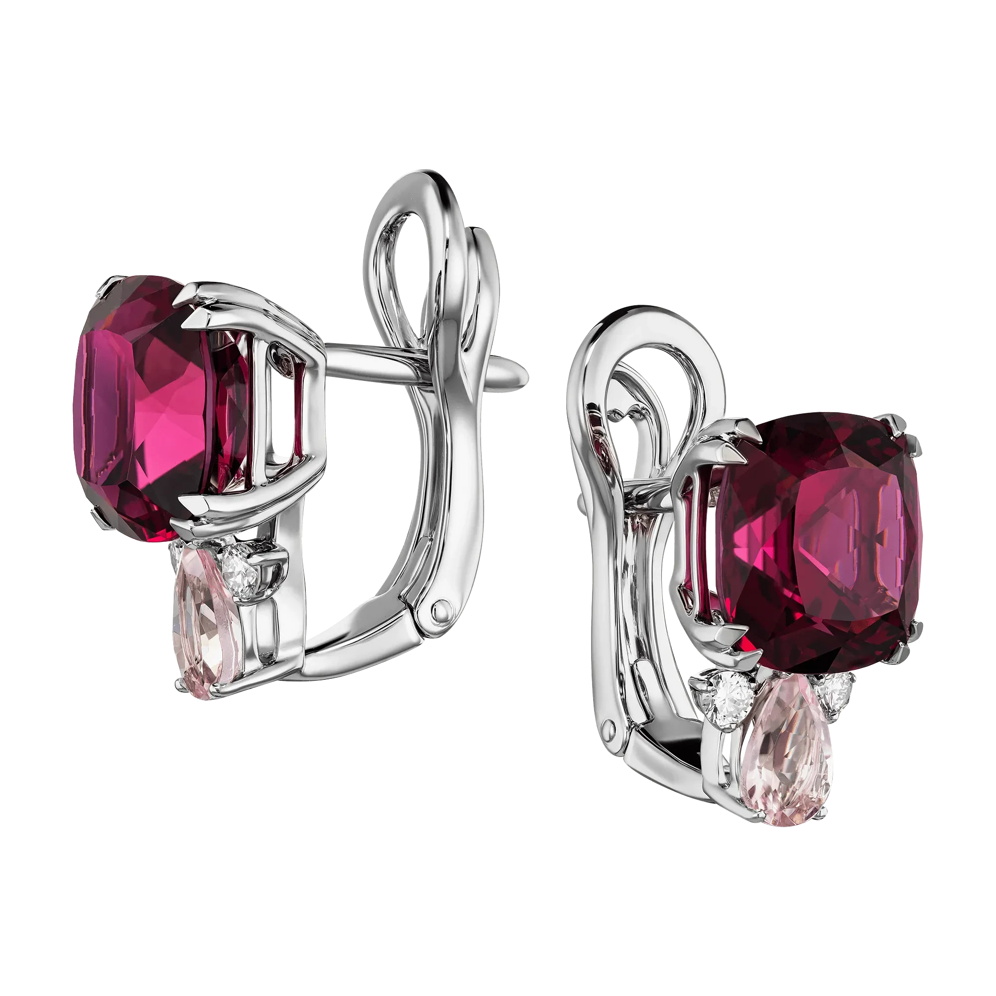 Крупные родолиты общим весом 9,48 карат сияют, словно спелые вишни в саду, освещённые мягким светом заката. Их вишнёво-розовый оттенок хранит в себе и сладость уходящего дня, и нежность вечернего дыхания природы, когда воздух напоён тишиной и предчувствием грядущей ночи.
