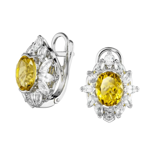 Бразильские цитрины тёплого солнечного оттенка раскрываются в ритме, где цвет воспринимается не вспышкой, а протяжённостью. Их сияние мягкое и ровное, без резких переходов, словно свет, который сопровождает движение, не меняя своей плотности. Белые сапфиры и бриллианты выстраивают вокруг камней чистое световое поле, добавляя глубину и сохраняя ощущение прозрачности и воздуха.