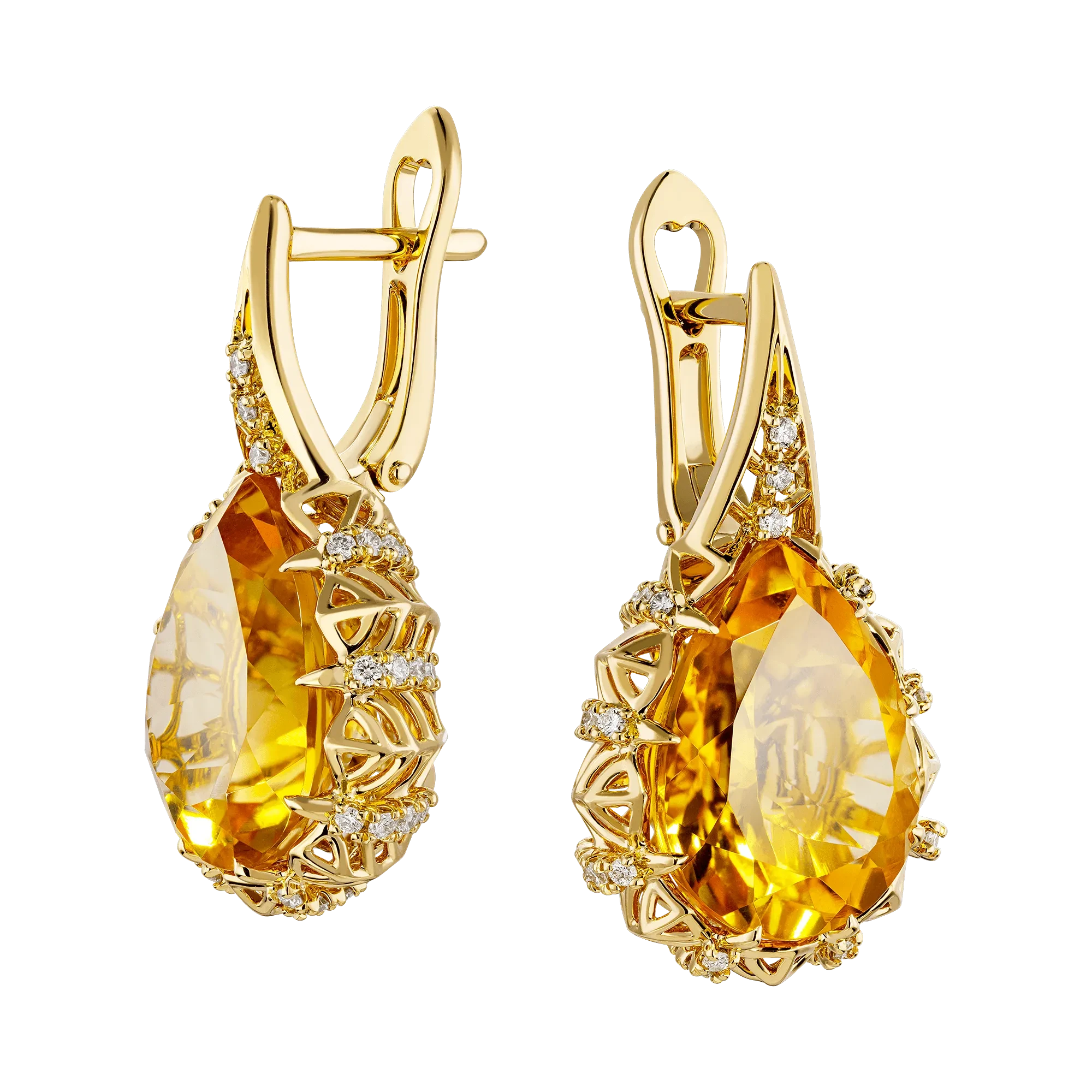 В притягательном образе украшения, созданного в соответствии с канонами роскошной классики, сразу выделяются два крупных цитрина, которые ювелиры мастерски обрамили завораживающим узором. Частью авторского ажура стала монограмма уральского бренда и многочисленные бриллианты, свежим блеском оттеняющие пылающую ярким светом глубину медового дуэта.