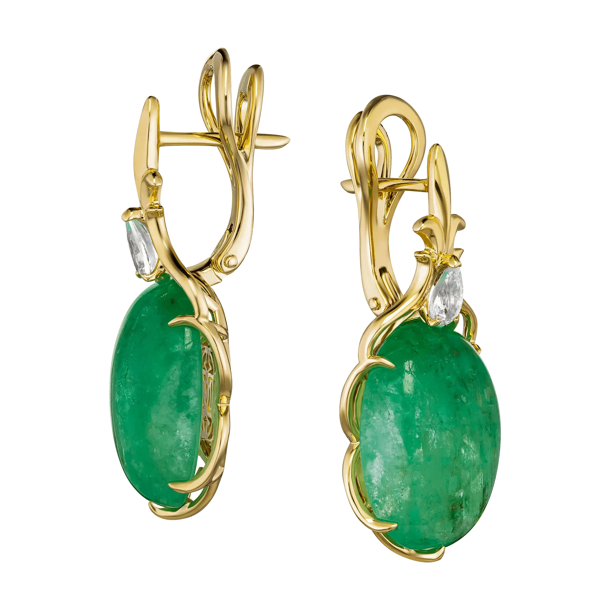 Оправы из жёлтого золота окутывают самоцветы теплом, создавая контраст между хрустальной прохладой изумрудов и сиянием металла. При каждом движении серьги словно оживают, отражая свет новыми оттенками – от прозрачного зелёного инея до глубокого малахитового свечения.
