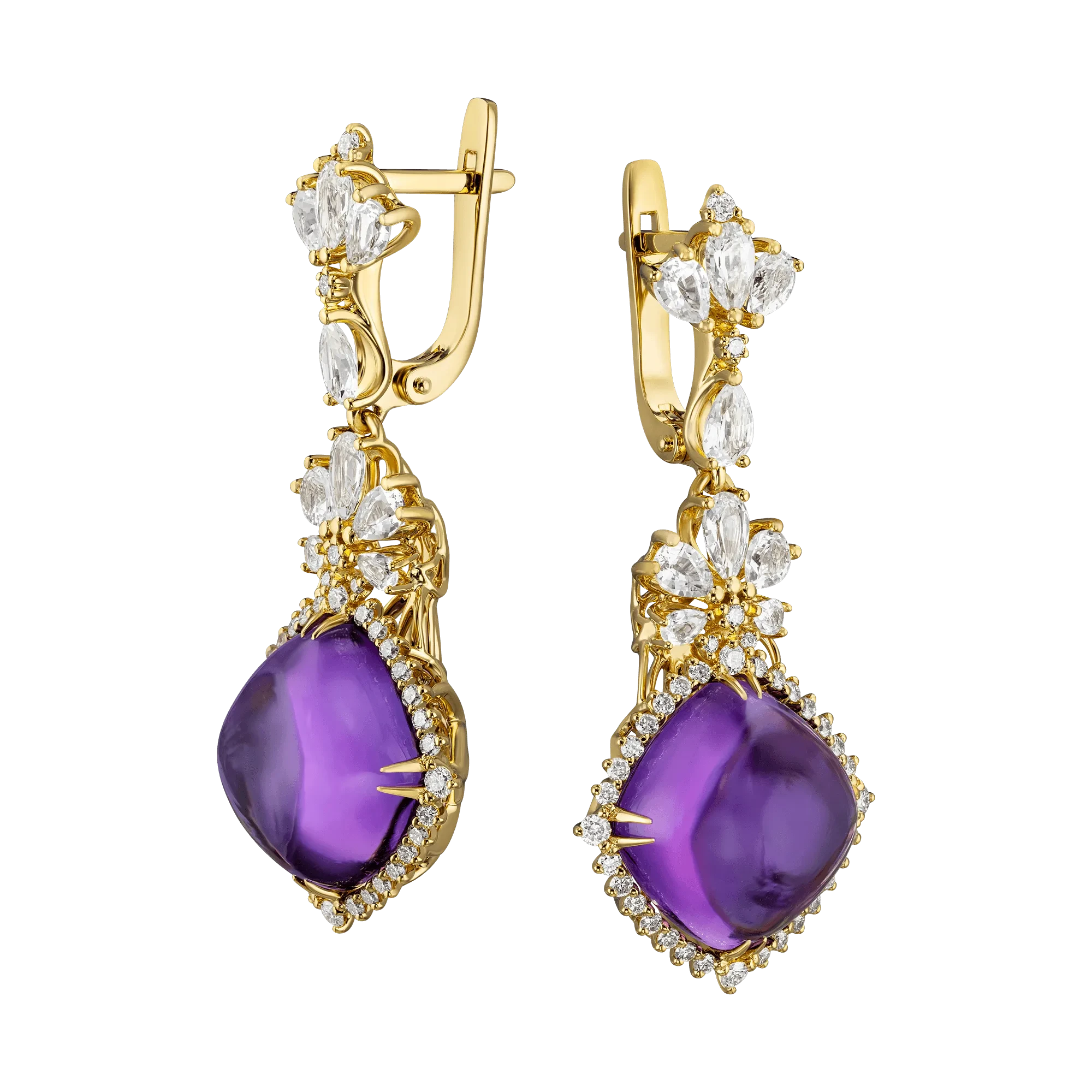 Почти сотня прозрачных кристаллов первого порядка идеально оттеняют насыщенный цвет аметистов, встречающийся очень редко не только среди драгоценных камней, но и в природе в целом. В этой игре контрастов, а также в мастерской работе ювелиров заключается та восторженная эстетическая гармония, которая позволит владелице эксклюзивных серег «Симфония ночи» чувствовать себя очень уверенно в высочайшем обществе.