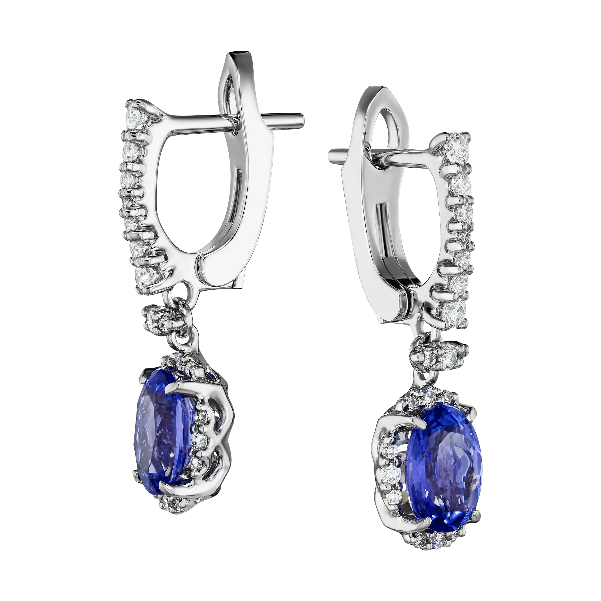 Интонация серёг отражается в цвете и раскрывается через движение, формируя цельный, выразительный образ. Танзаниты общим весом 2,47 карата словно собирают в себе разные состояния неба — от прохладной голубизны до глубокого синего с тонкими фиолетовыми переливами. Их природная изменчивость создаёт ощущение глубины и живого сияния, каждый раз раскрывающегося по-новому.
