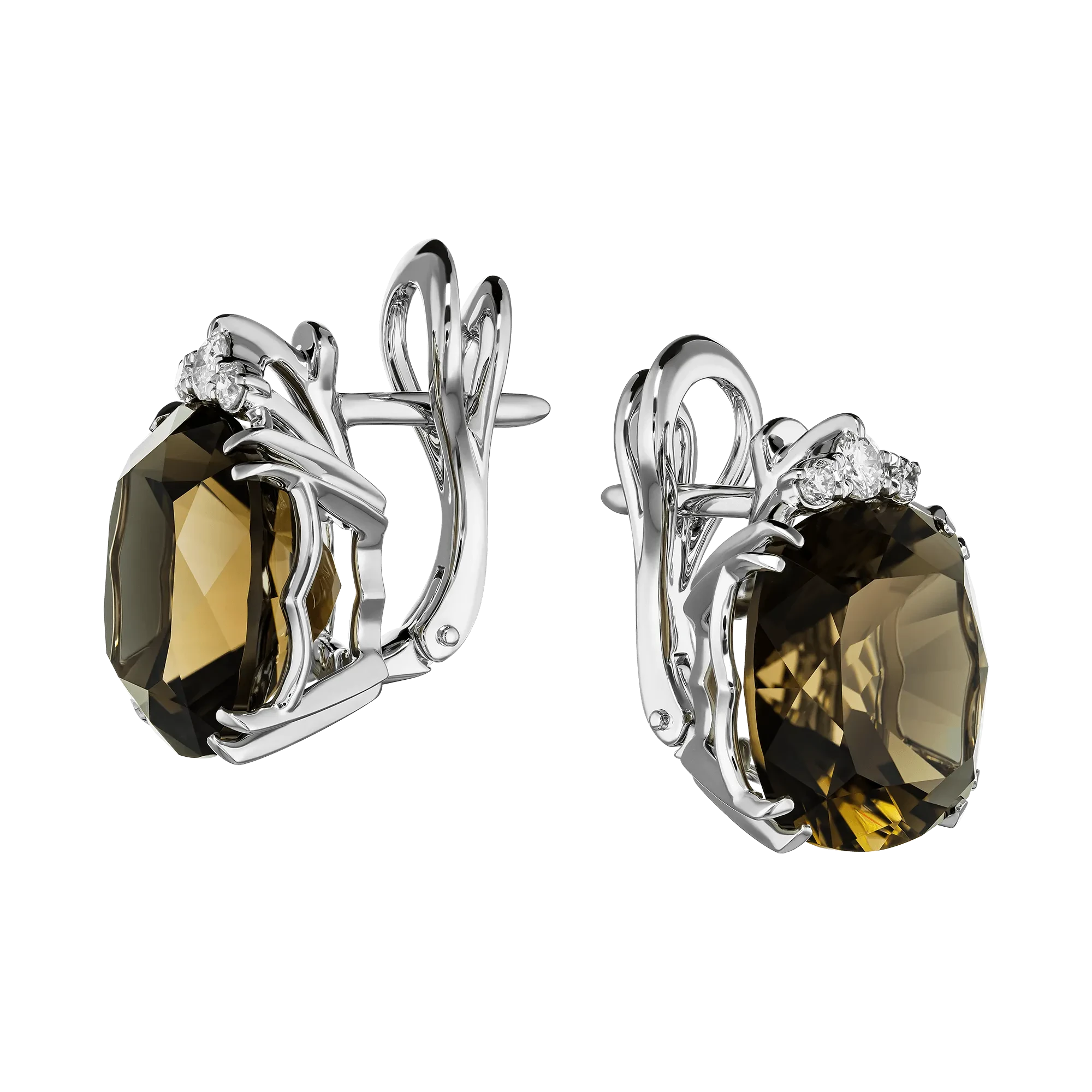 В центре каждой серьги – дымчатый кварц из бразильского Минас-Жерайс, региона, где природа рождает кристаллы с редким, тёплым бронзово-дымчатым оттенком. Камни будто удерживают в себе отблеск заката: их цвет меняется от прозрачного янтарного сияния до густого сумеречного полутона, создавая живую игру света при каждом движении.