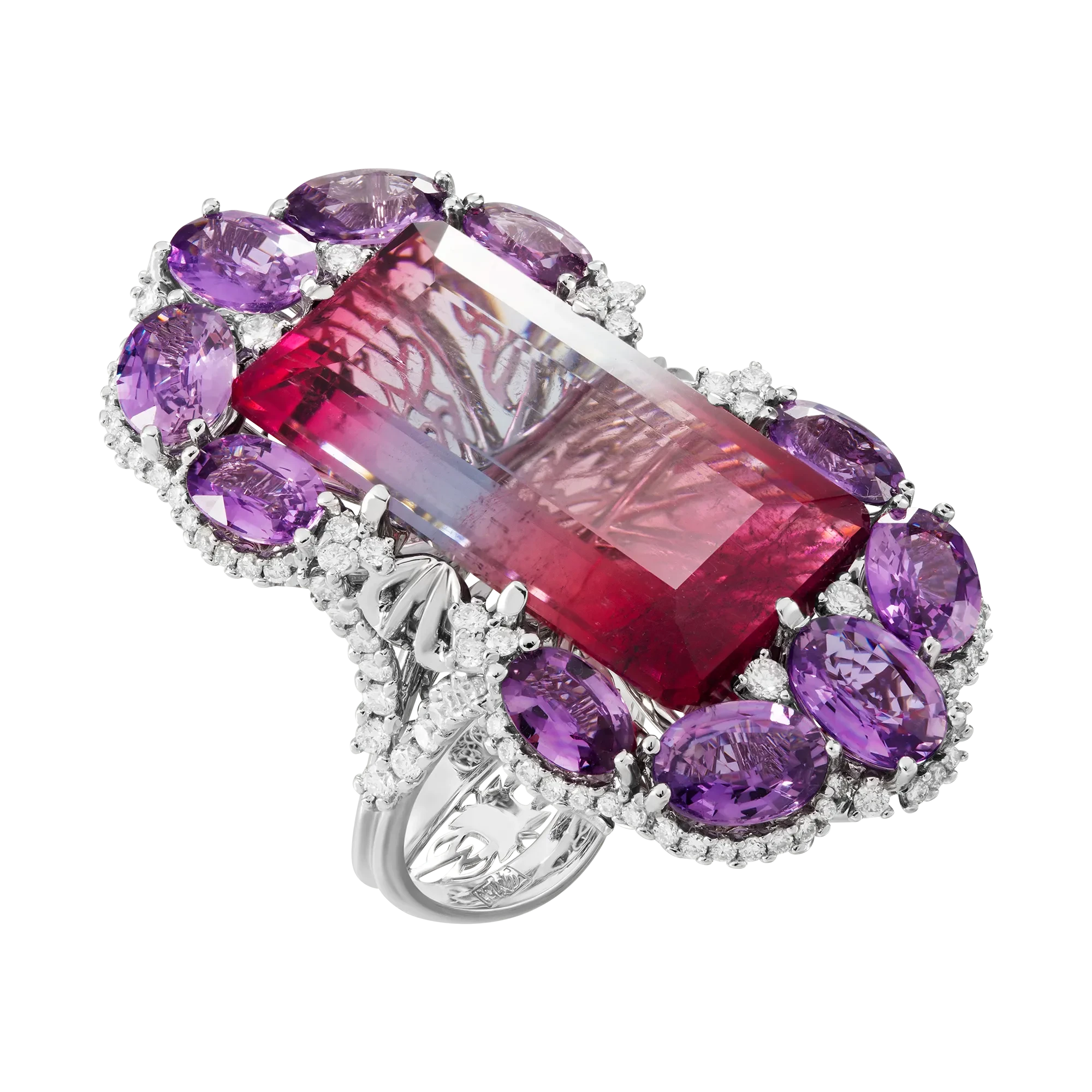 Завершают виртуозную палитру ювелирного шедевра прозрачные бриллианты и нежно лавандовые сапфиры, которые словно драгоценными лепестками покрывают оправу из белого золота и обрамляют крупные бразильские кристаллы общим весом 55,51 карат.