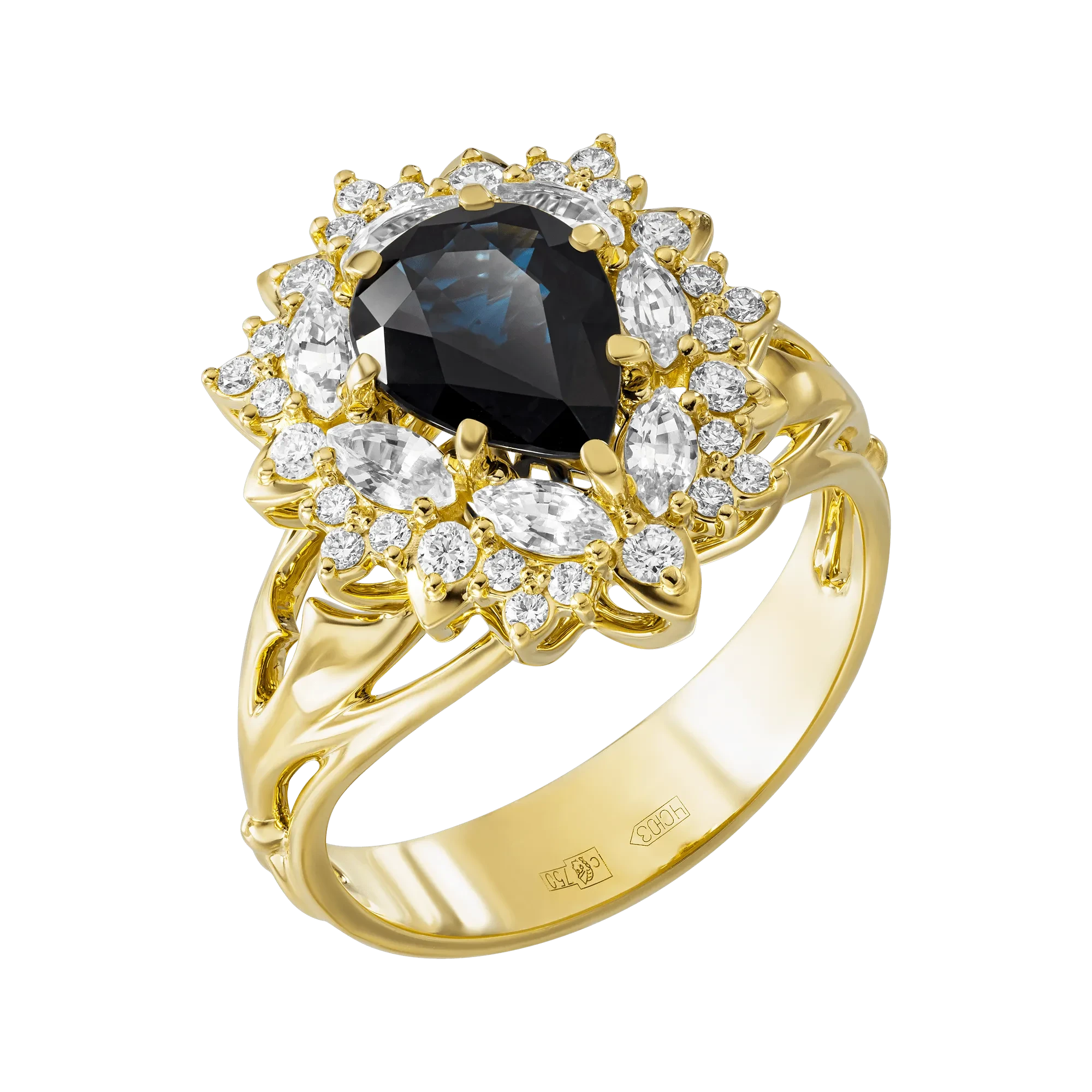 Все элементы изящной парюры из желтого золота в форме раскрывающихся цветков, и кольцо и серьги, пронизаны истинным французским шармом и выполнены в характерной для элитного ювелирного дома изысканной манере. Характеризуя авторский драгоценный комплект как королевское украшение, в центре сияют три завораживающих сапфира глубокого синего цвета, в котором, кажется, застыло величие самого древнего правящего дома в Европе – Гримальди, приведшего Монако к вершинам процветания.