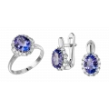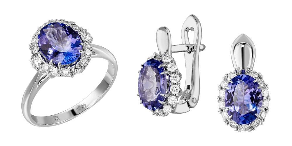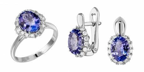 Отождествляя гарнитур с очень современным украшением, мастера выбрали в качестве главного акцента юные по меркам самоцветов танзаниты. Их уникальную способность – демонстрировать все оттенки бескрайней синевы, призваны подчеркнуть множественные бриллианты, расположенные аккуратным сводом вокруг центральных сокровищ.