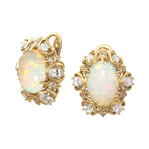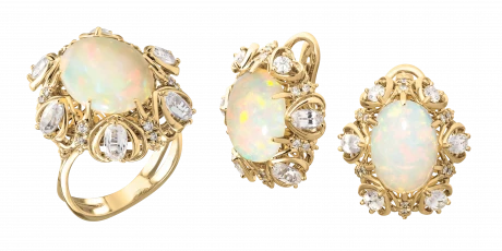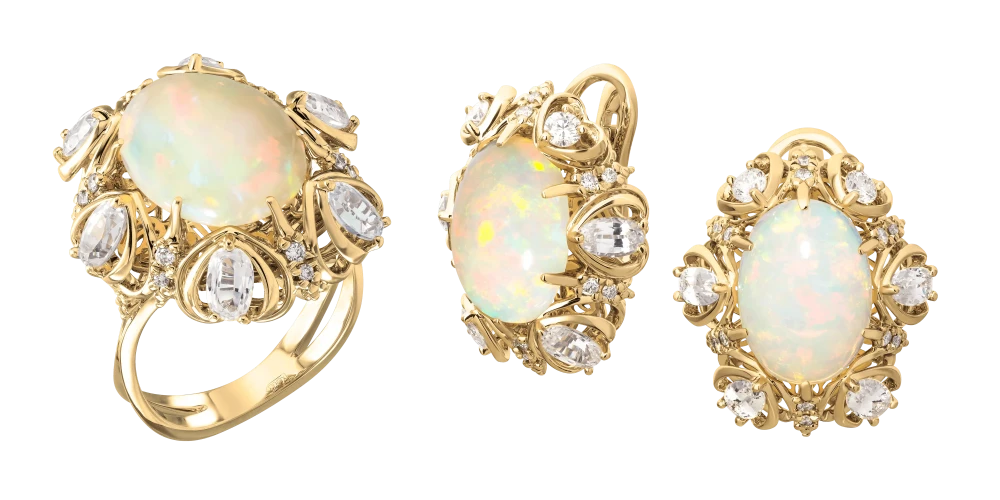 Чтобы авторский гарнитур сверкал особенно красочно, ювелиры украсили его тремя редчайшими опалами, чей молочный оттенок особенно привлекает тех, кто верит в магическую силу драгоценных камней. Ведь именно такие минералы обладают позитивной энергией в неограниченном количестве, отличаясь, таким образом, не только выдающимися характеристиками.