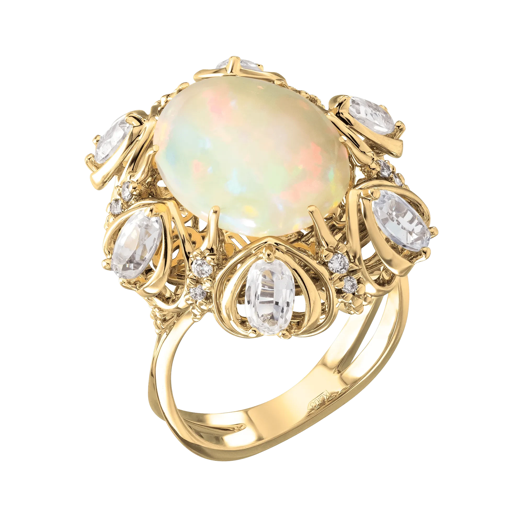 Подчеркивая несравненную красоту чистейшего трио общим весом 15,80 карата, добытого в Эфиопии, мастера окружили крупные центральные самоцветы, поражающие фееричной игрой красок, то сменяющихся, то вспыхивающих одновременно, россыпью сапфиров и бриллиантов различной огранки, сливающихся со светом опалов в неистовом фееричном танце огней.