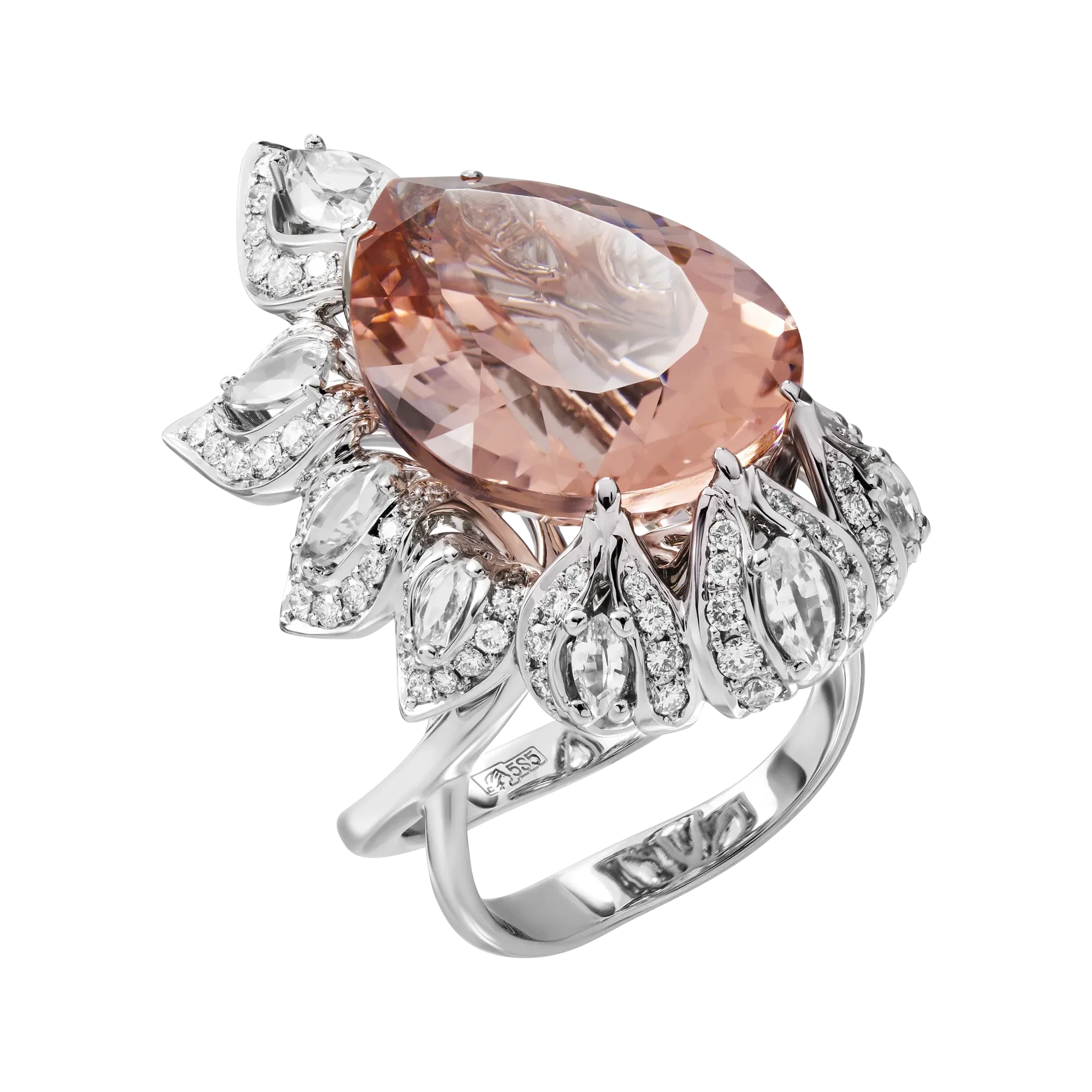 Золотой орнамент оправы, инкрустированной чистейшими белыми сапфирами и ослепительными бриллиантами, служит ложе для сентиментальных морганитов. Благодаря искусной огранке в виде капли, бразильские самоцветы очаровывают игрой розовых оттенков и таинственным свечением из самой глубины.