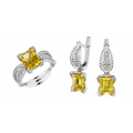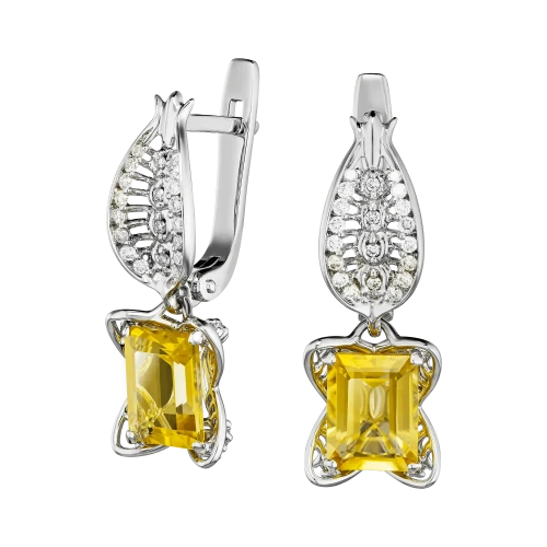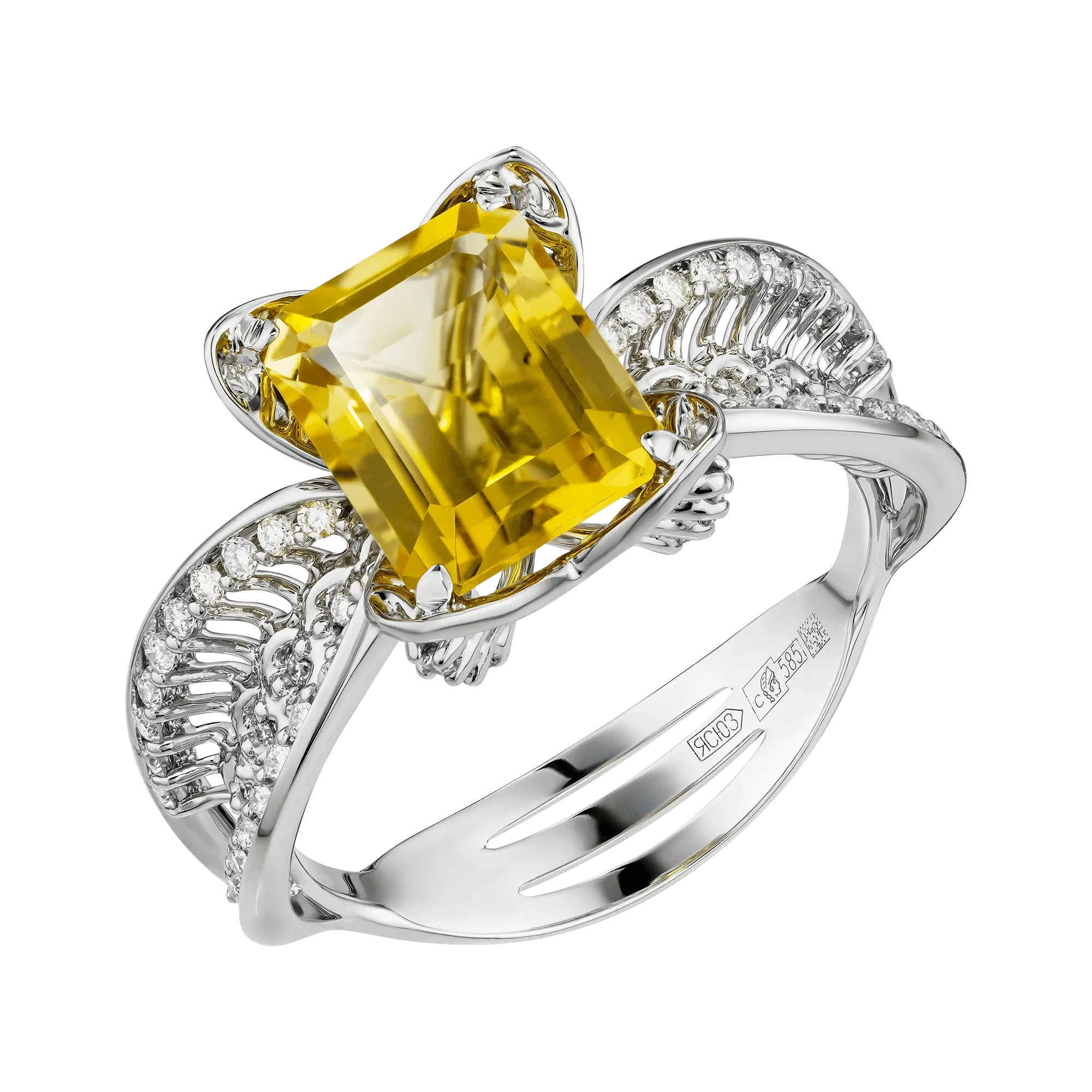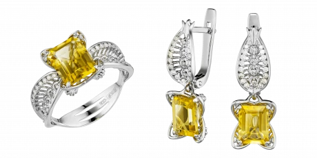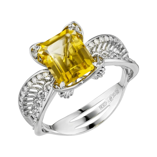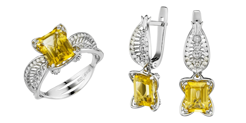 Цитрины ярко-медового оттенка образуют сердцевину украшения. Их прозрачность и насыщенность создают плотный, собранный свет, воспринимаемый как устойчивый и спокойный. Ажурные линии белого золота, инкрустированные бриллиантами, формируют сложный световой контур, в котором оттенок приобретает дополнительную глубину и многослойность, раскрываясь в движении.