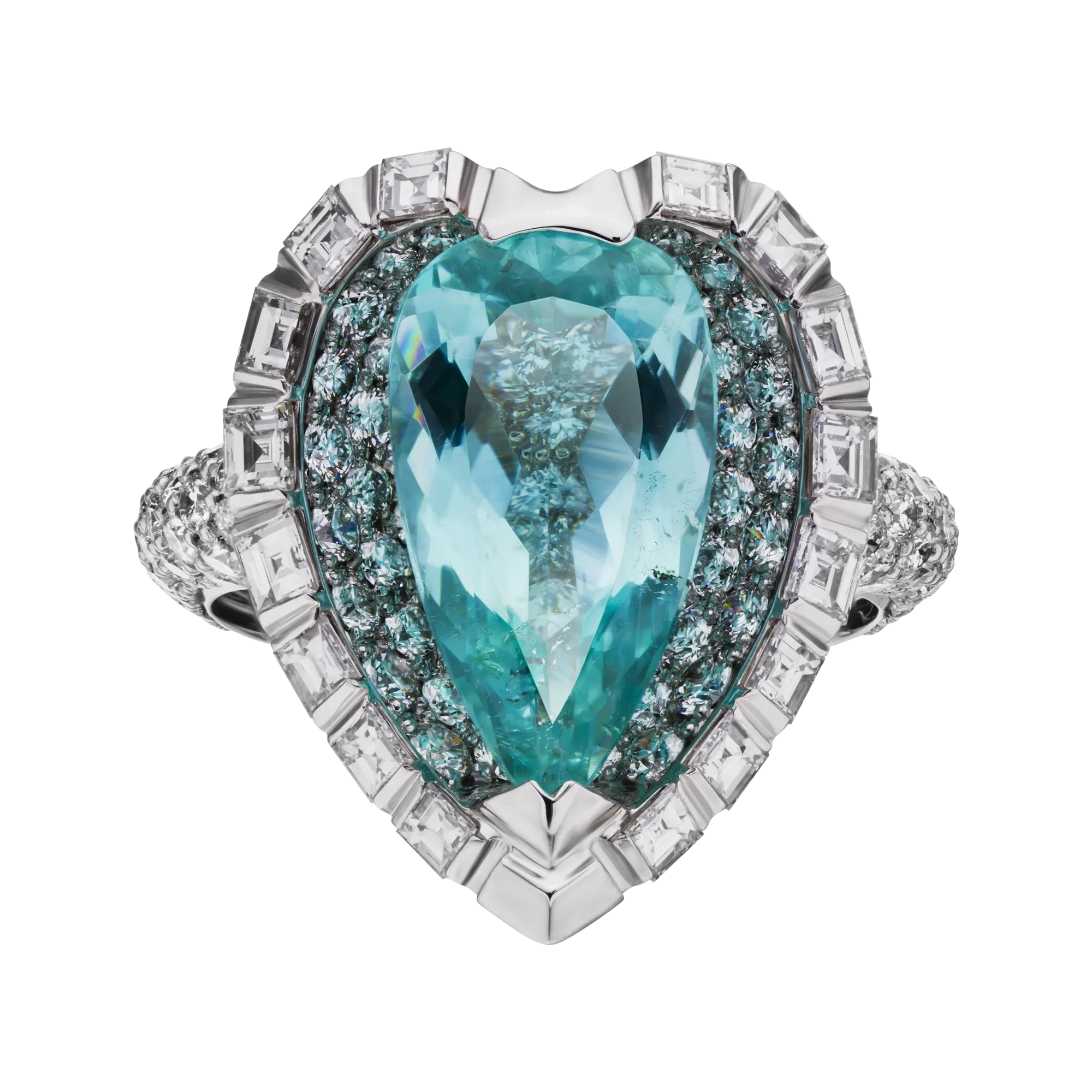 Взгляните на кольцо сверху. Его форма в виде сердца, выложенного бриллиантами классической круглой огранки, символизирует любовь, которую турмалины Параиба сразу вызывают у ценителей истинно прекрасного. Ведь он считается одним из самых красивых камней на планете.