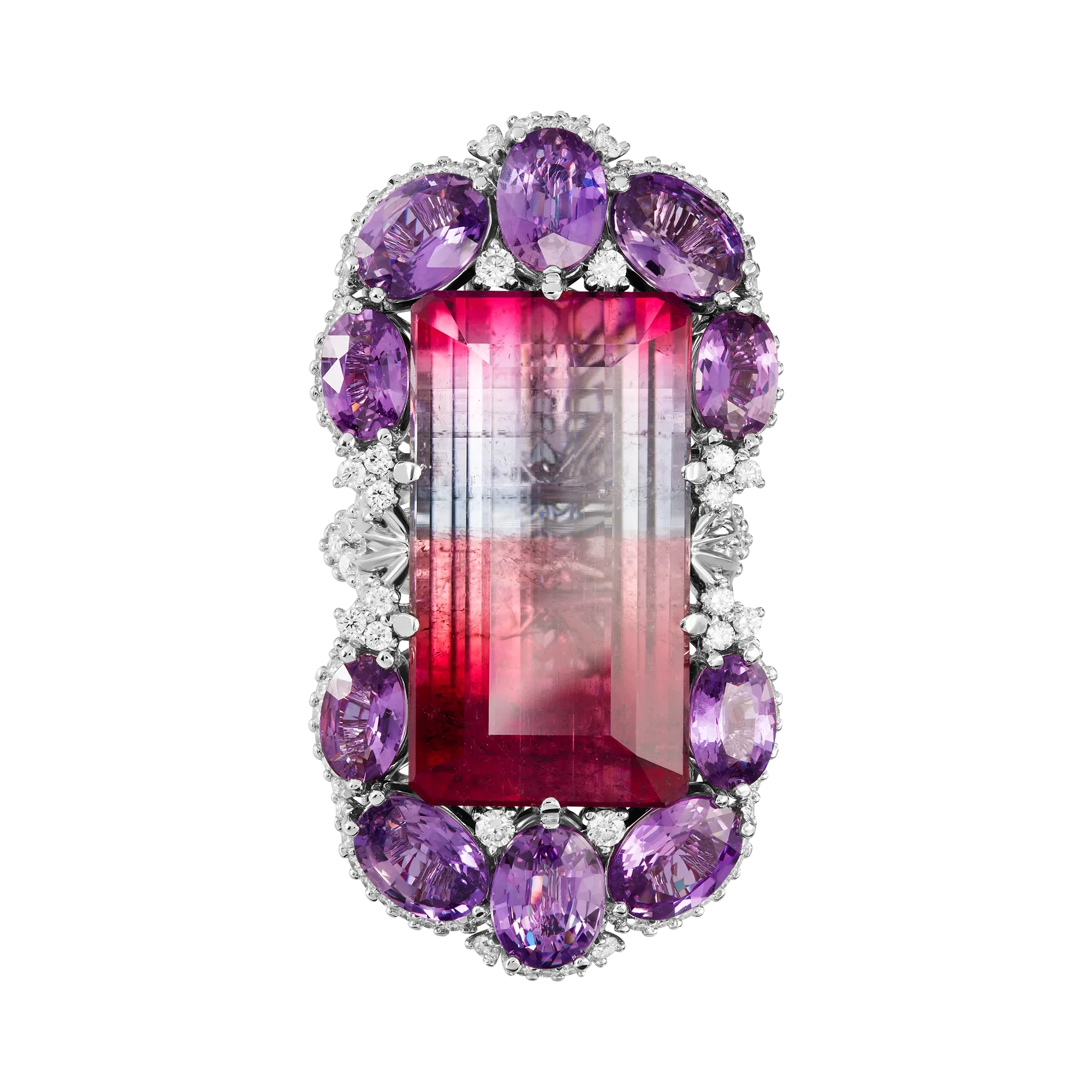 Нежно лавандовые сапфиры, окружающие искусно ограненный центральный кристалл, завораживают шедевральным сиянием в унисон игре света на гранях турмалина.