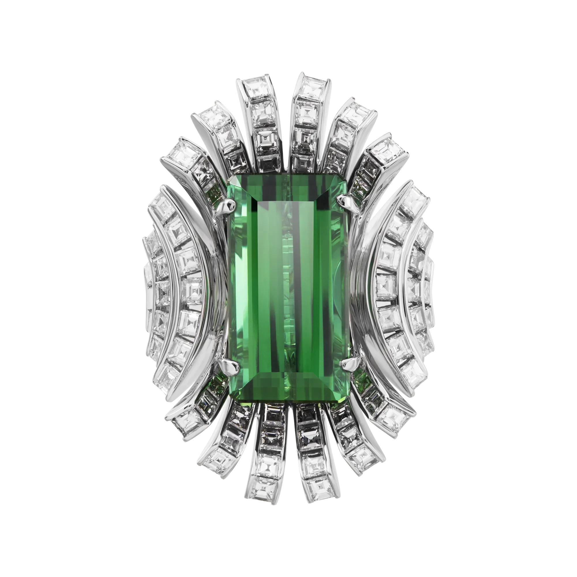 Высокохудожественная оправа из золота служит ослепительным глянцевым фундаментом для апогея потрясающего украшения – редчайшего турмалина весом 12,93 карат. Его головокружительная прозрачность – это светлое будущее, а его многовековая история – это волнующее прошлое.
