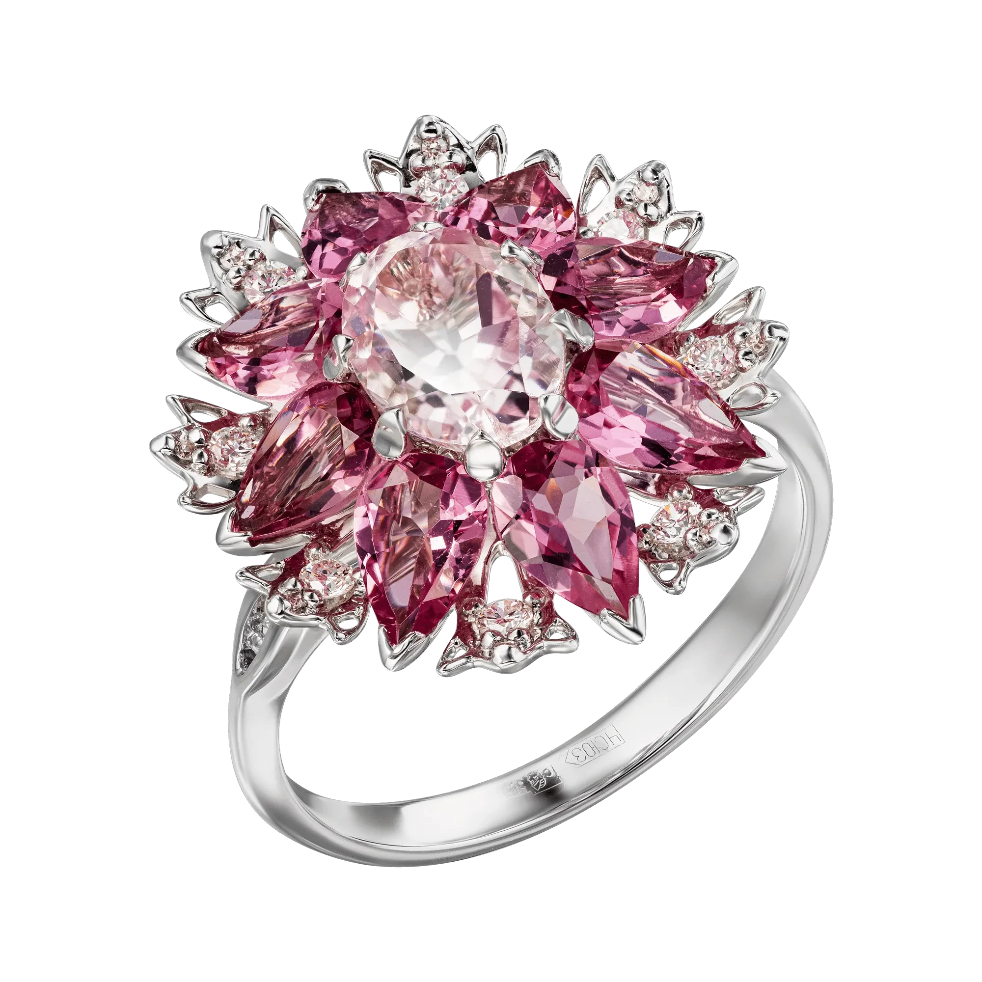 Сердце ювелирного шедевра наполняет легкий розовый цвет в двух его артистичных оттенках. Нежный, первых мгновений заката – это чистейший морганит весом 1,24 карат, а более насыщенный, похожий на палитру неба в апофеозе уходящего солнца – это россыпь турмалинов. Оригинальная игра легкого контраста выглядит очень свежо и созвучно неувядающей молодости благодаря множеству бриллиантов, перистым прозрачным сиянием говорящим о той вечности, которую принято считать благородным признаком истинного аристократизма.