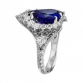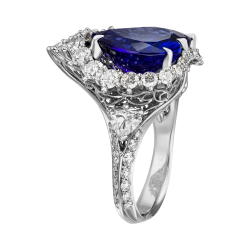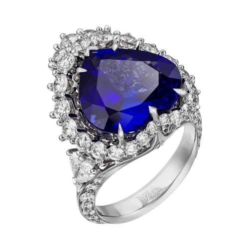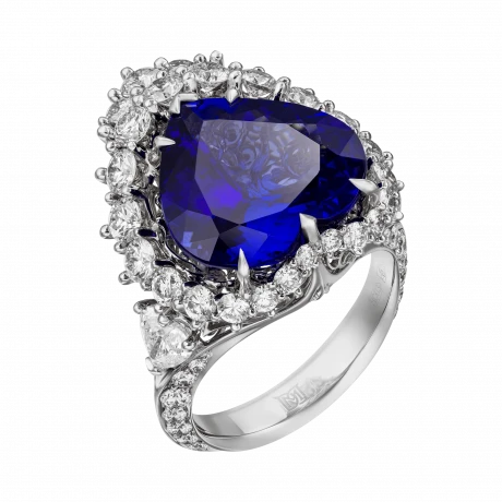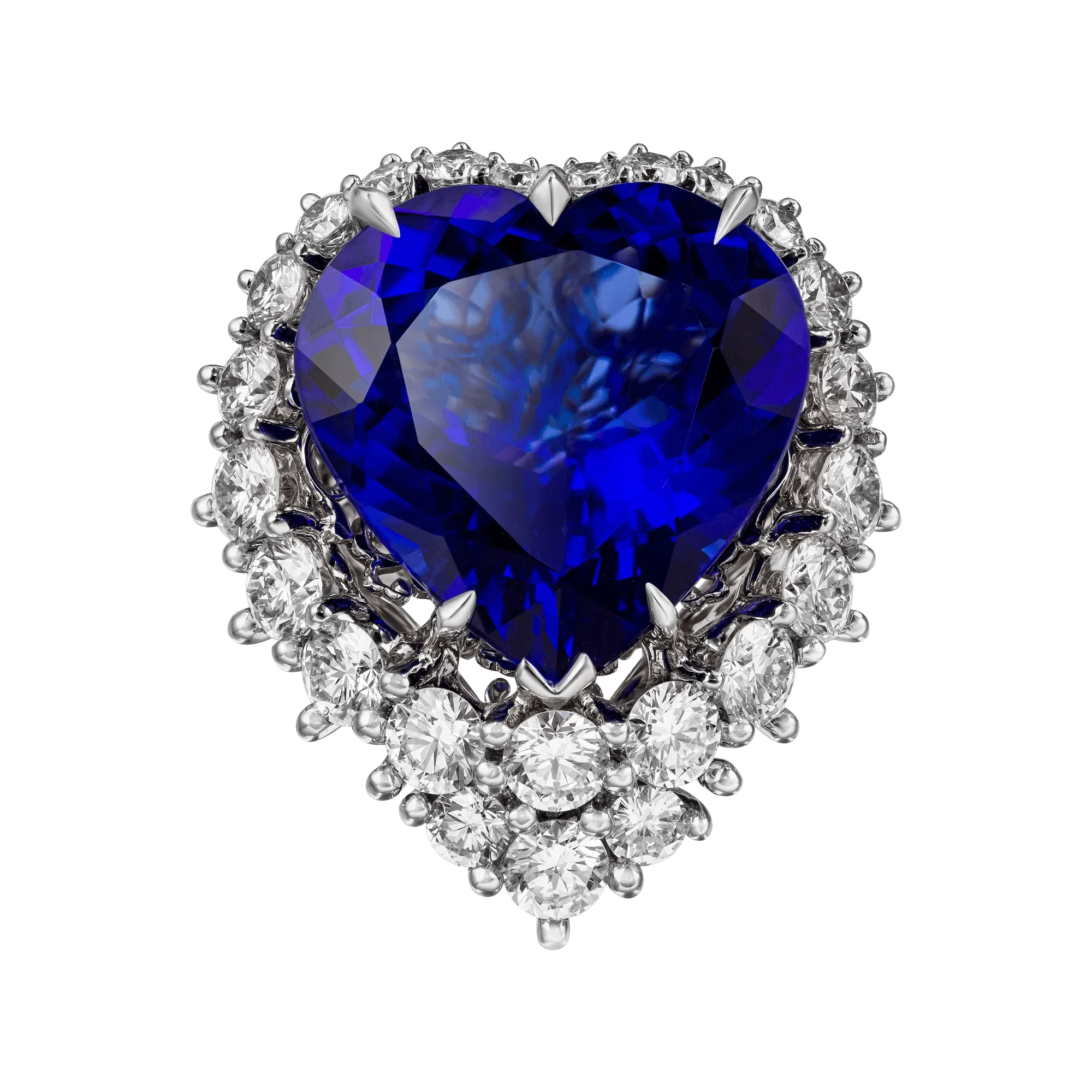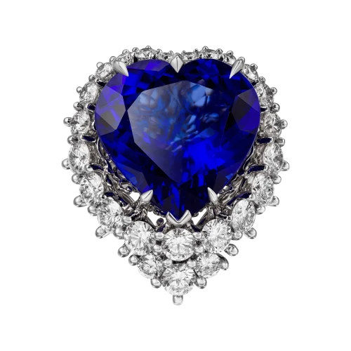 Величественную красоту головокружительного шедевра ювелиры обозначили при помощи редчайшего танзанита, виртуозно ограненного в форме сердца. Элегантный силуэт африканского самоцвета исключительной чистоты весом 7,70 карат идеально подчеркивает сверкающее обрамление более чем из полусотни бриллиантов.