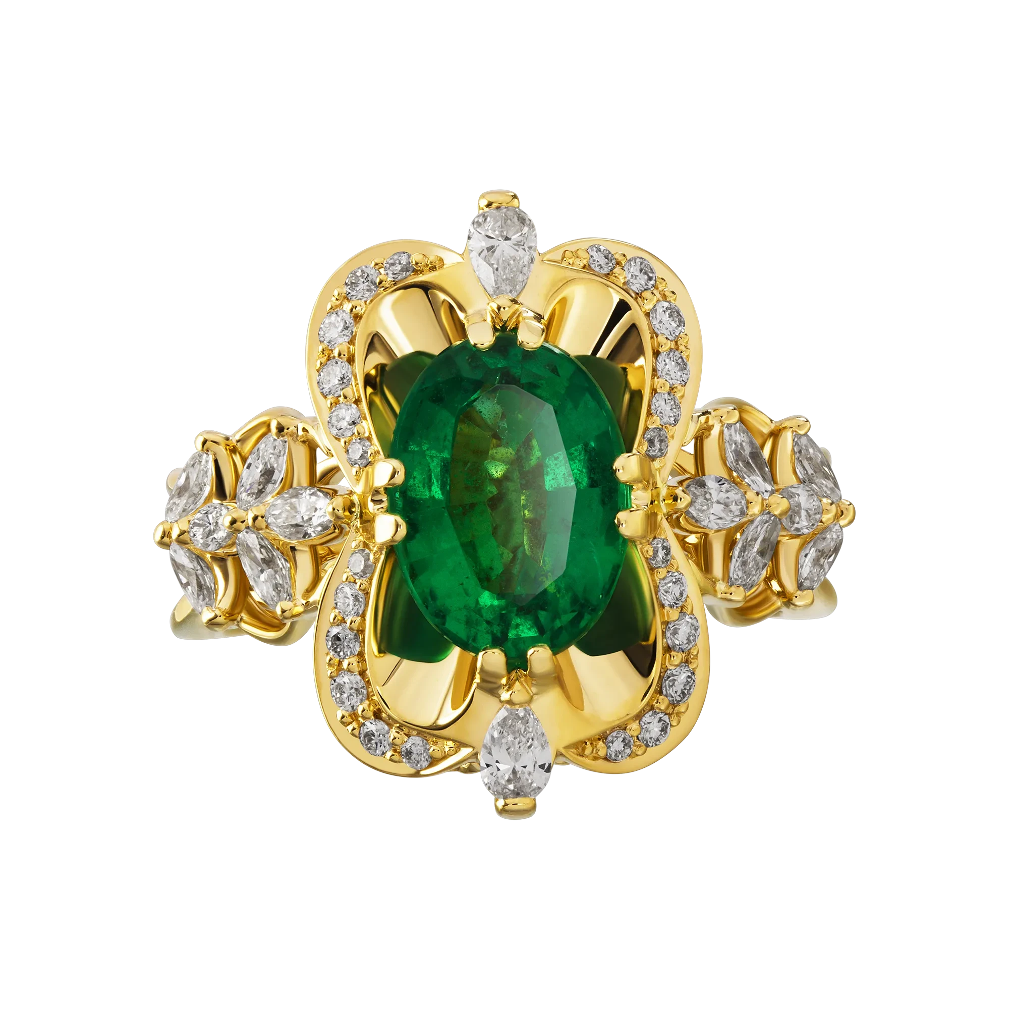 Витиеватый узор из желтого золота, подчеркнутый сиянием 38 благородных бриллиантов, идеально дополняет гармонию кольца, созданную, в первую очередь, сиянием редчайших драгоценных камней.