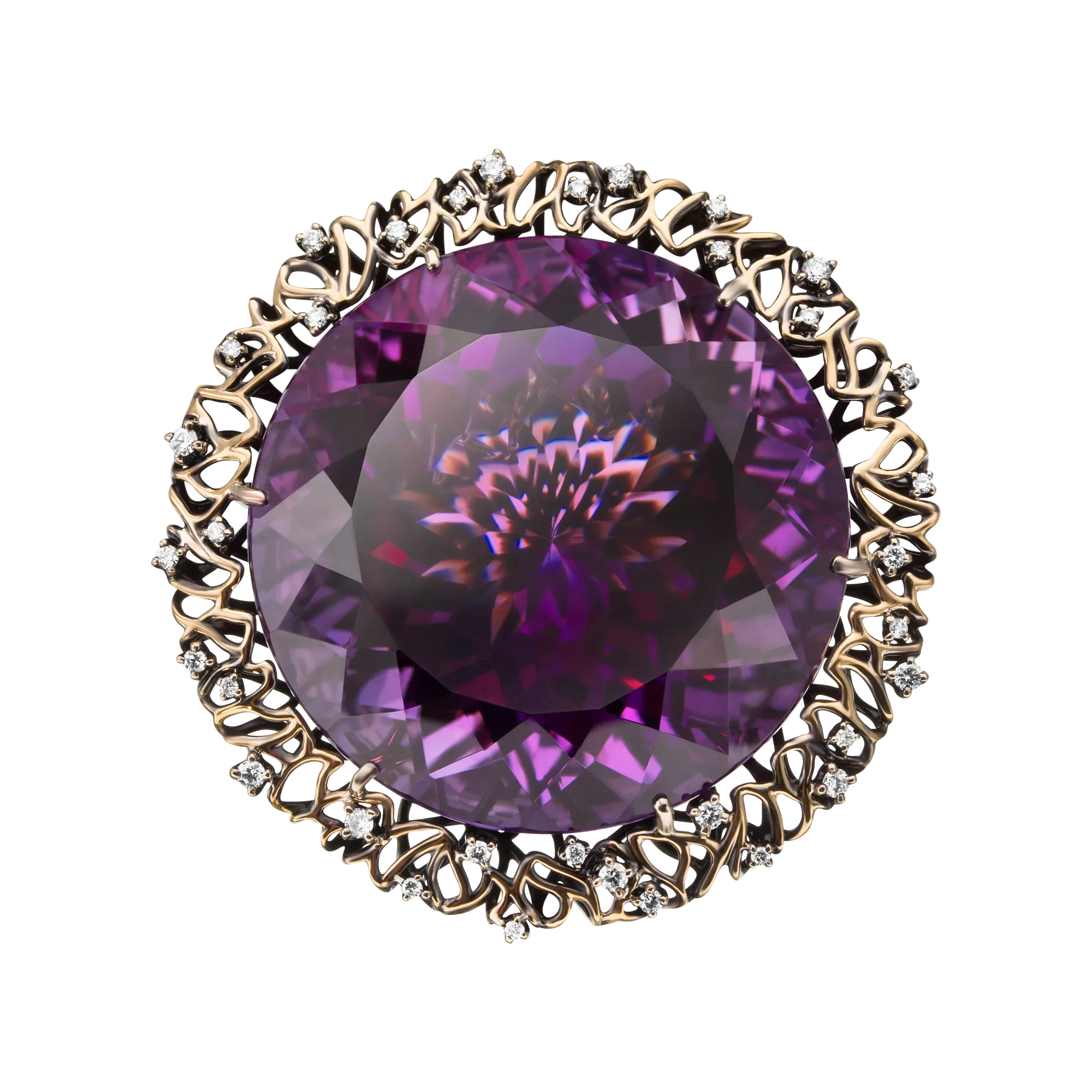Завораживающий блеск чистейшего аметиста, добытого в Боливии, заключает головокружительный шедевр в драгоценную ауру загадочности, чье волшебство многократно увеличивается благодаря более восьмидесяти сверкающим бриллиантам, окружающих южноамериканский кристалл весом 82,96 карат и вплетенных в сложносочиненный паттерн из белого золота.