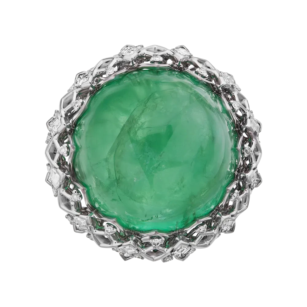 Авторское кольцо из белого золота станет незабываемым подарком для стильной и состоятельной женщины, поклонницы уникальных природных камней. В изящную оправу, усыпанную бриллиантами квадратной и круглой огранки, заключен массивный уральский изумруд-кабошон. Камень поражает своей загадочной глубиной, вглядываясь в которую хочется забыть обо всем на свете!