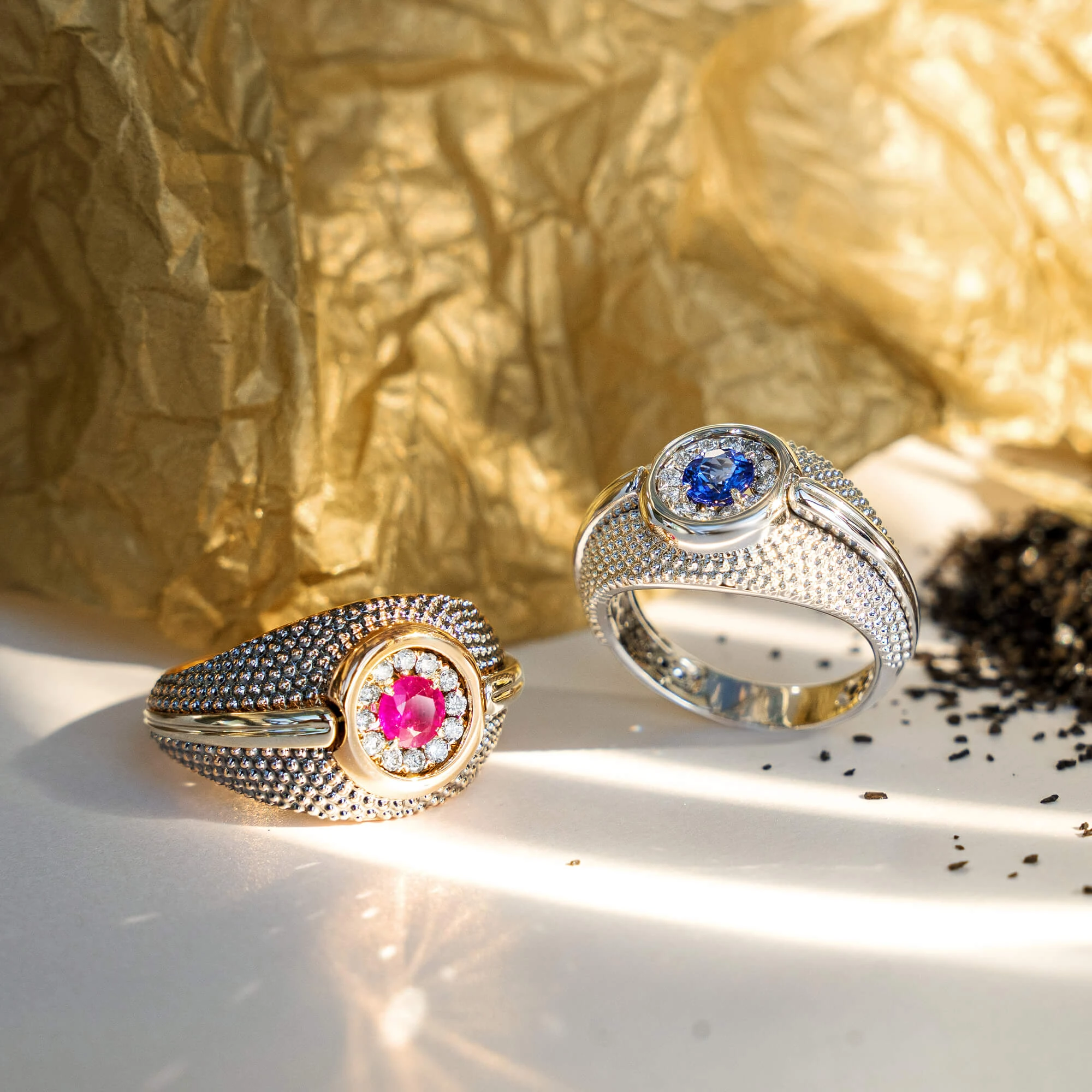 Подчеркнув, таким образом, главенство шпинели, мастера, к тому же, выделили ее полосой из желтого золота, которая, будто луч солнца, рассекает оригинальный узор на поверхности головокружительного кольца, которое придаст уверенности и украсит образ мужчины.