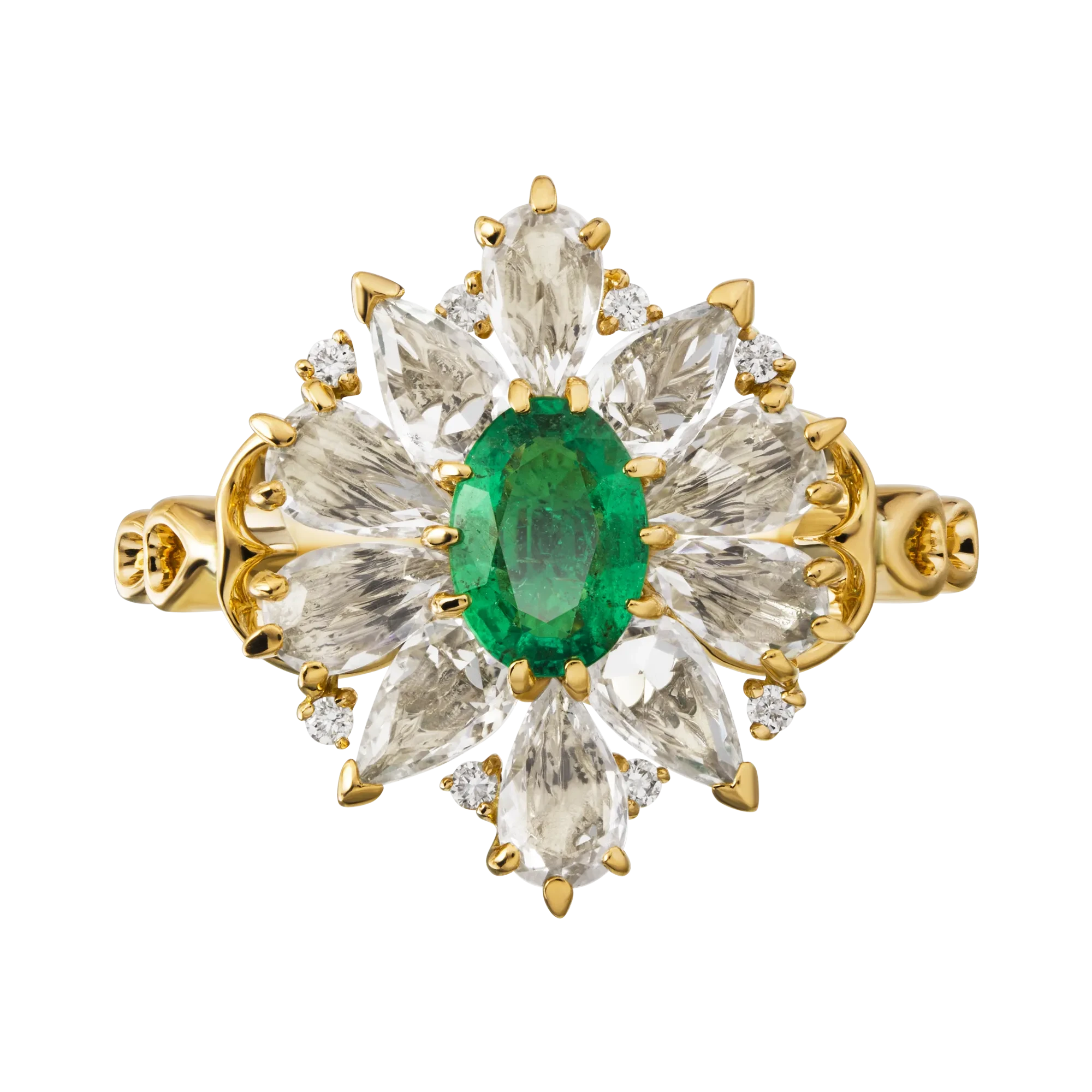 Обрамив сиятельный, насыщенно зеленый центр эксклюзивной драгоценности сверкающими бриллиантово-сапфировыми лепестками, мастера виртуозно подчеркнули цветовой баланс украшения, где умеренная красочность выступит лучшим подтверждением вкуса стильной и чувственной владелицы.