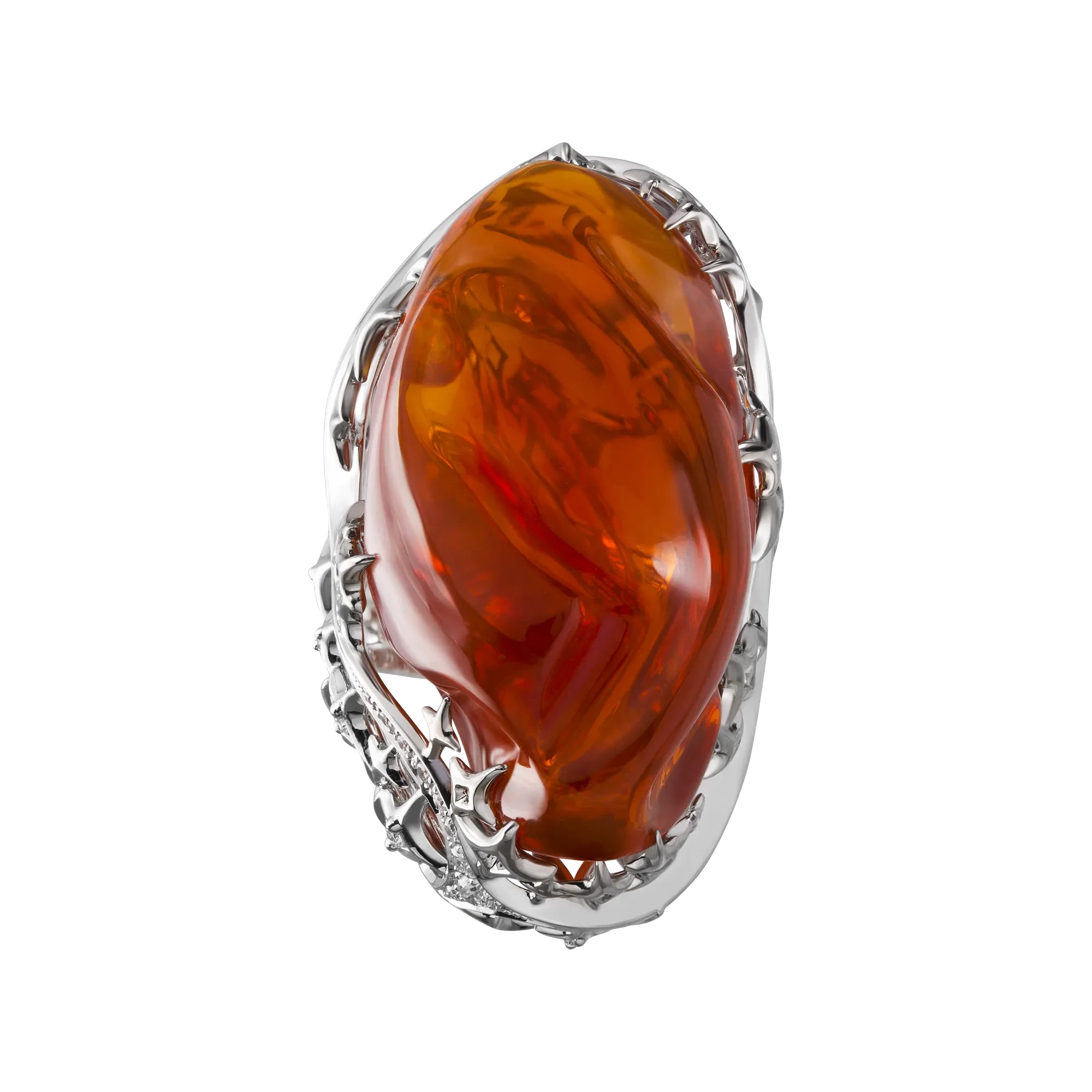 Как истинные мастера, ювелиры Maxim Demidov выбрали в качестве оправы для огненного камня белое золото, ведь этот металл приумножает магические силы самоцвета. А россыпь бриллиантов, как будто отражает огонь опала, приумножая его.