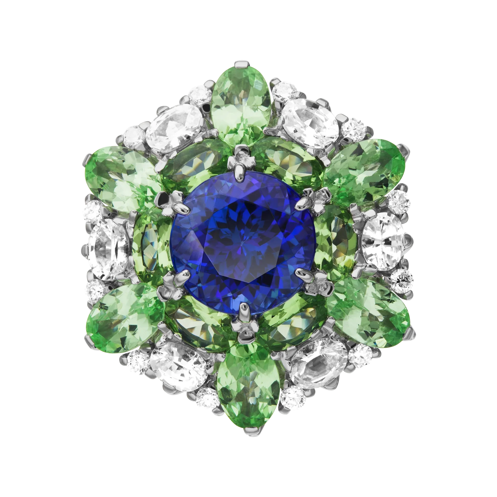 В стильную оправу, выполненную в форме цветка, заключены редчайшие ювелирные экспонаты – бриллианты, тсавориты и танзанийские сапфиры высшего качества. В центре украшения красуется природный танзанит, который в сочетании с остальными камнями создает невероятную игру света. Стоит обратить внимание, что сегодня танзаниты встречаются крайне редко, а мировые запасы их ограничены. Поэтому минералы данной группы имеют высокую коллекционную ценность, не уступая алмазам, рубинам и сапфирам. Украшения с тсаворитами могут позволить себе лишь избранные особы. Одной из наиболее известных поклонниц этого самоцвета была звезда Голливуда, законодательница моды и стиля, крупнейший коллекционер драгоценностой – Элизабет Тейлор.