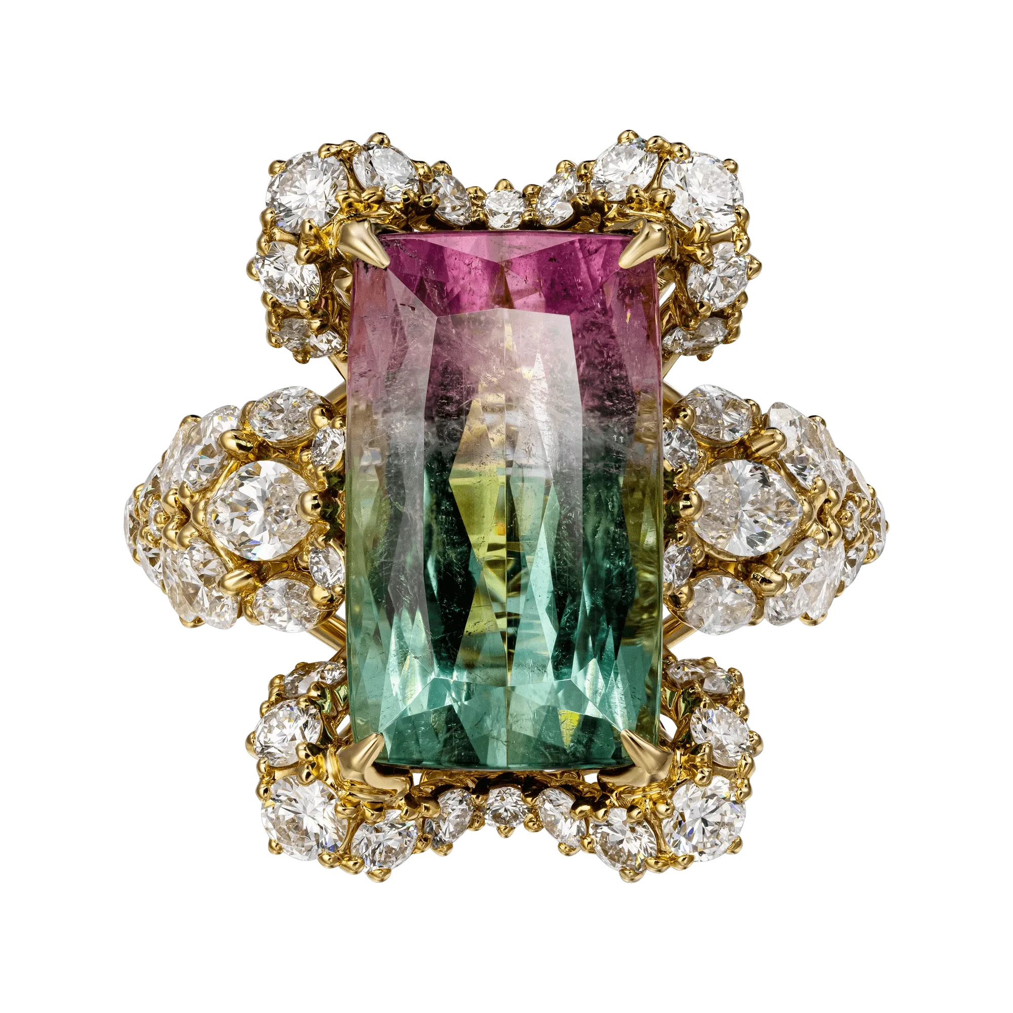 В авторском кольце «Творческая классика» такой чудесной артистичной изюминкой стал крупный полихромный турмалин, завораживающий сложной цветовой палитрой, удивляющей даже тех, кто привык к красочным фокусам природы.
