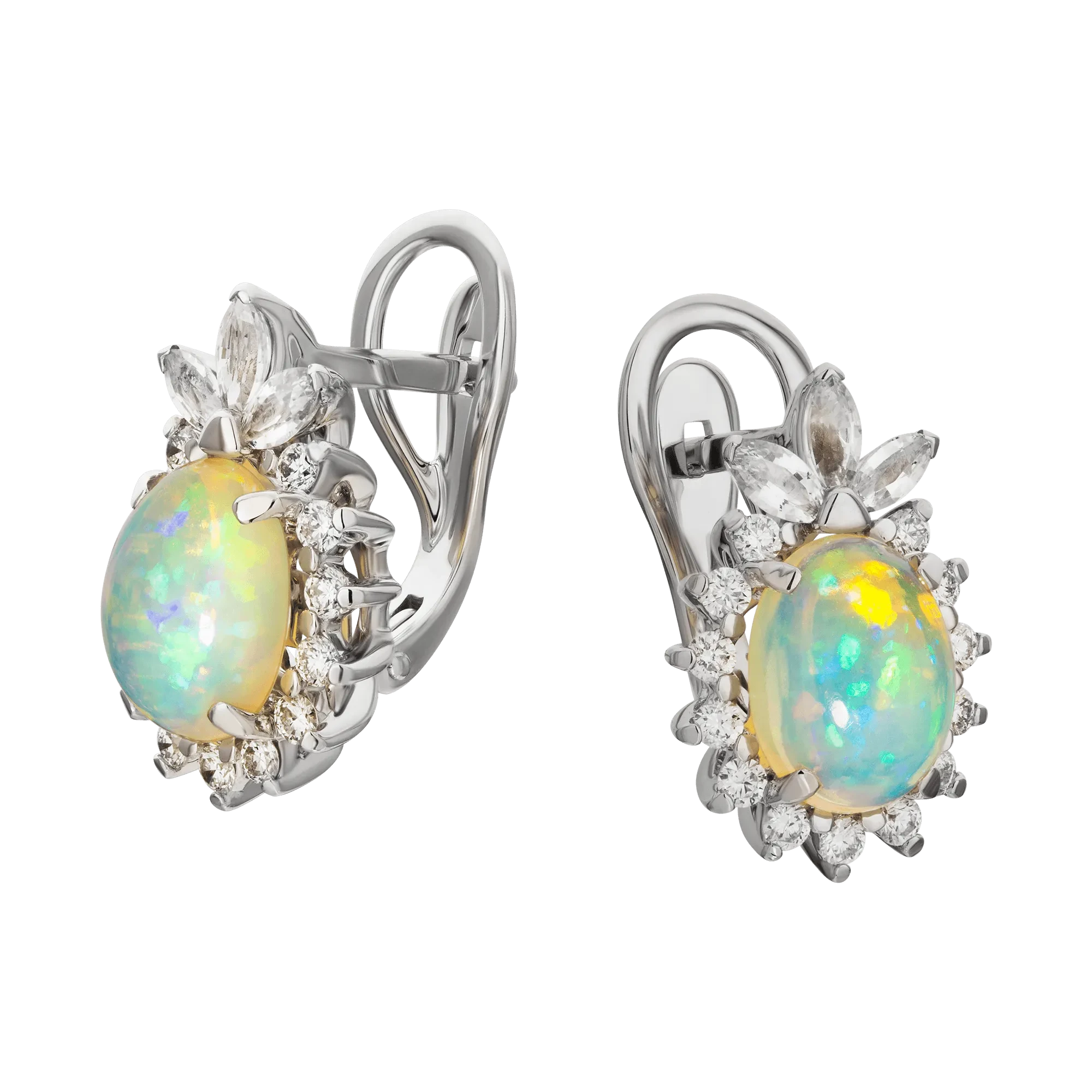 В центре композиции – дуэт эфиопских опалов, поражающих игрой оттенков и переливов. Их опалесценция рождает сотни тонких бликов – от лавандовых и бирюзовых до золотисто-розовых. Драгоценные камни словно живут в постоянном движении, отражая эмоции и настроение своей обладательницы.