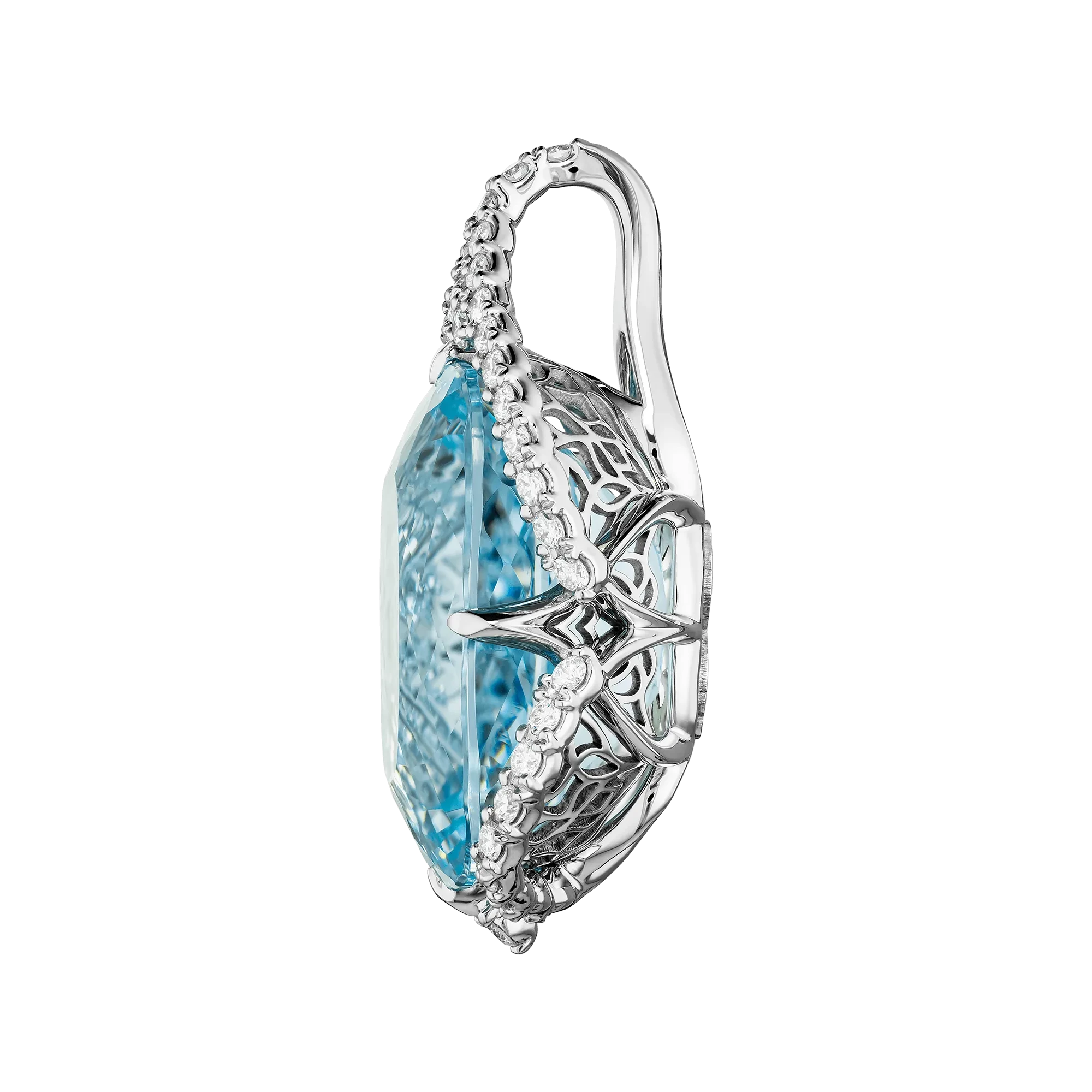 Архитектура украшения построена на тонком балансе масштаба и лёгкости. Россыпь бриллиантов, выложенная по контуру оправы из белого золота, формирует чёткую форму капли и усиливает световую динамику центрального камня, направляя свет внутрь аквамарина. Такое решение подчёркивает его прозрачность и позволяет камню «дышать», не утяжеляя образ.