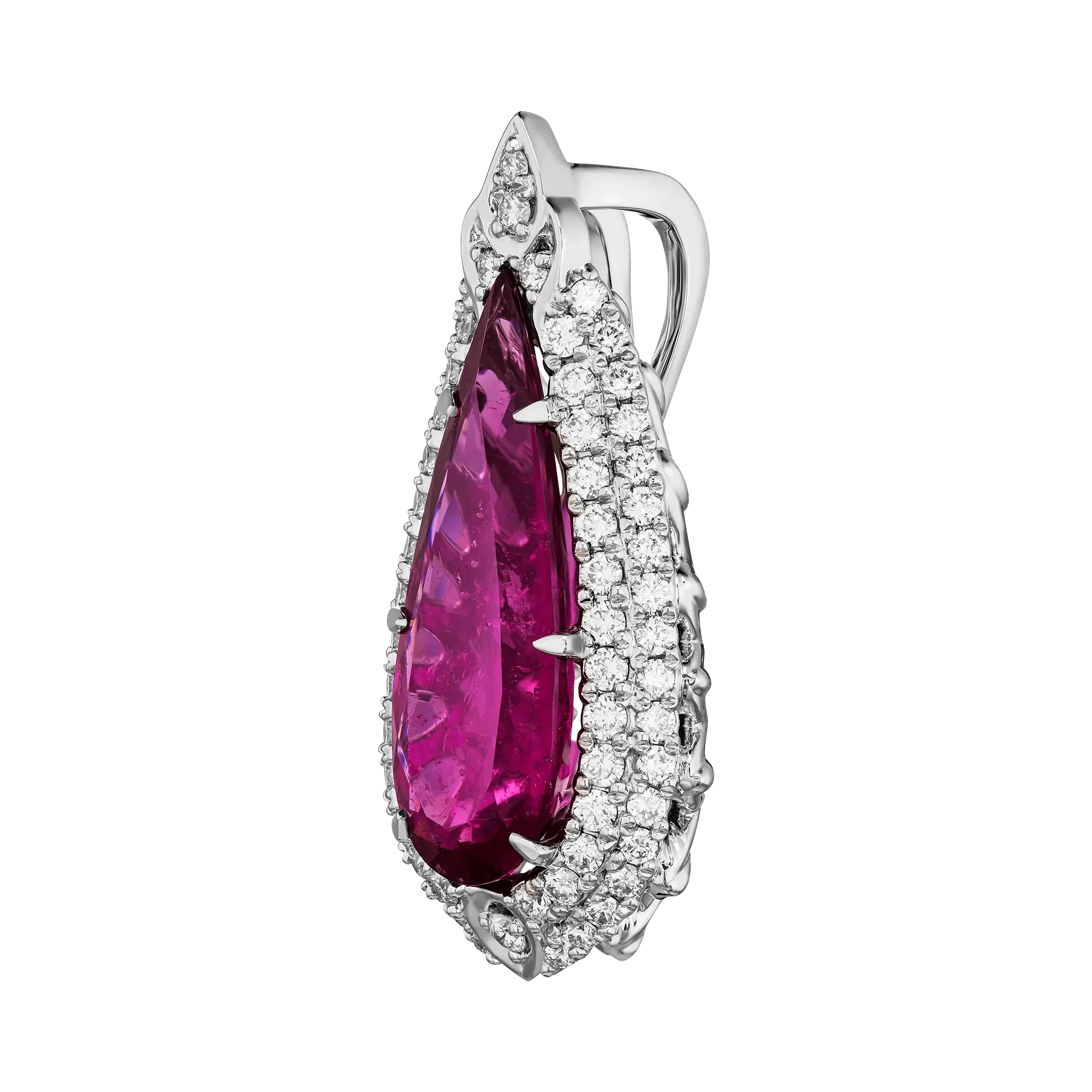 Бриллианты, обрамляющие камень, повторяют форму капли, создавая ауру света, в которой рубеллит раскрывает всю силу своего сияния. Белое золото подчёркивает его прозрачность и насыщенность, превращая подвеску в символ радости и внутреннего равновесия.