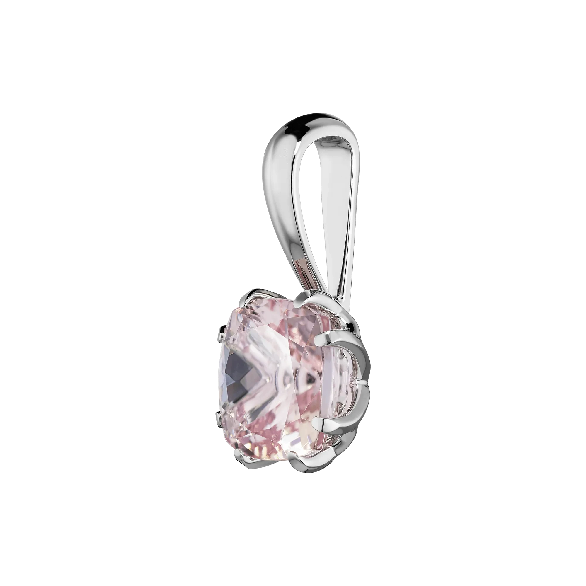 В центре композиции — морганит нежно-розового оттенка, отличающийся прозрачностью и тонкой цветовой глубиной. Его свет словно рождается внутри кристалла и раскрывается постепенно, создавая ощущение мягкого движения и внутренней гармонии. Самоцвет притягивает не яркостью, а деликатным теплом и утончённой эмоциональностью.