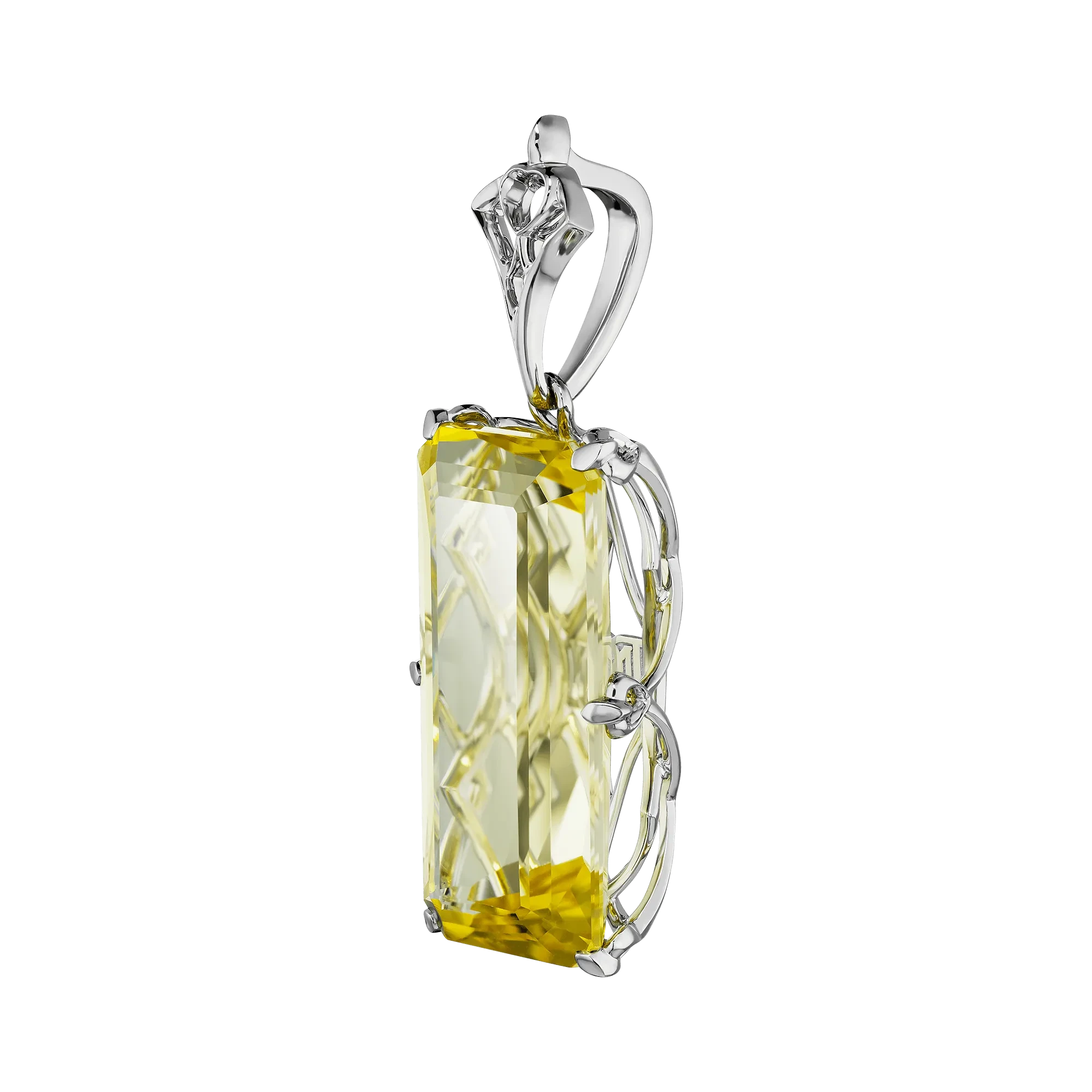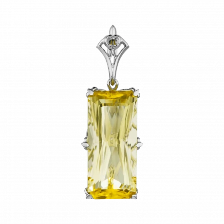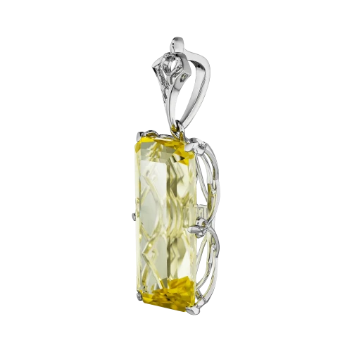 Ажурная оправа из белого золота выстроена так, чтобы не замыкать форму, а оставлять пространство для света и воздуха. Сквозь прозрачность скаполита проступают линии металла, создавая ощущение глубины и архитектурной точности. Подвеска не подчёркивает статус — она его фиксирует.