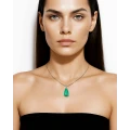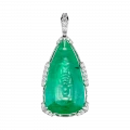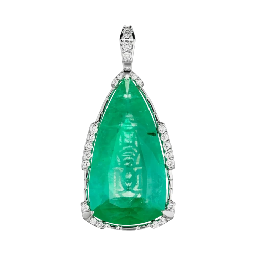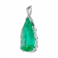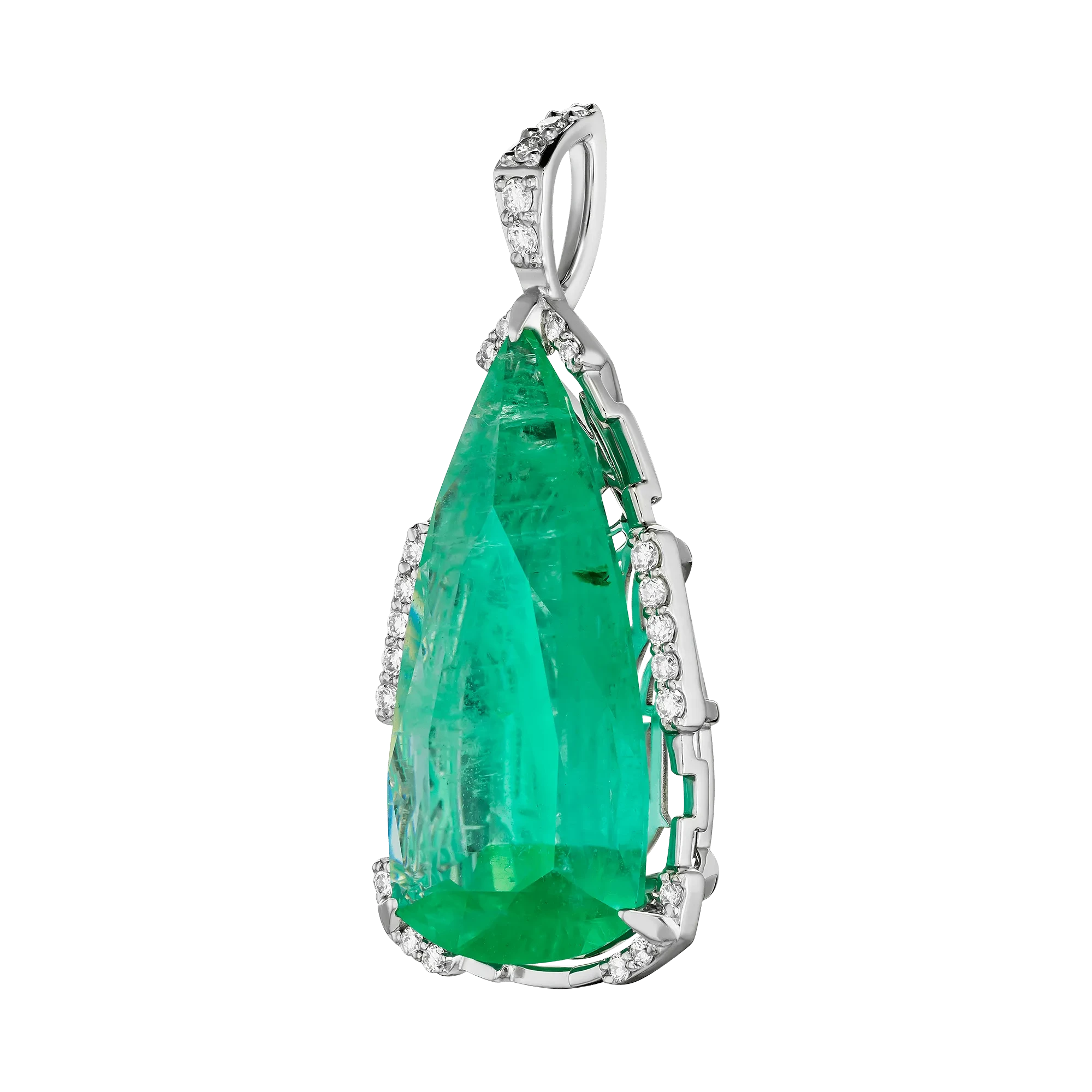 В центре подвески — уральский изумруд весом 7,51 карата, добытый на Малышевском месторождении — единственном промышленном источнике изумрудов в Евразии. Фантазийная огранка в форме вытянутой капли усиливает пластику минерала и позволяет свету мягко скользить по его граням, раскрывая естественную интенсивность тона.